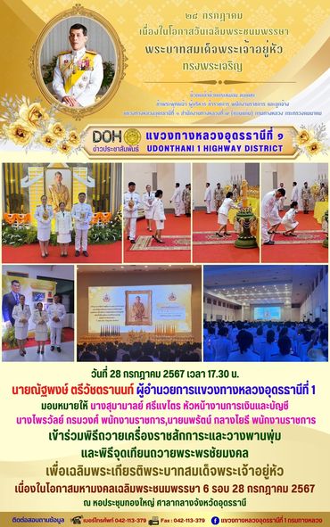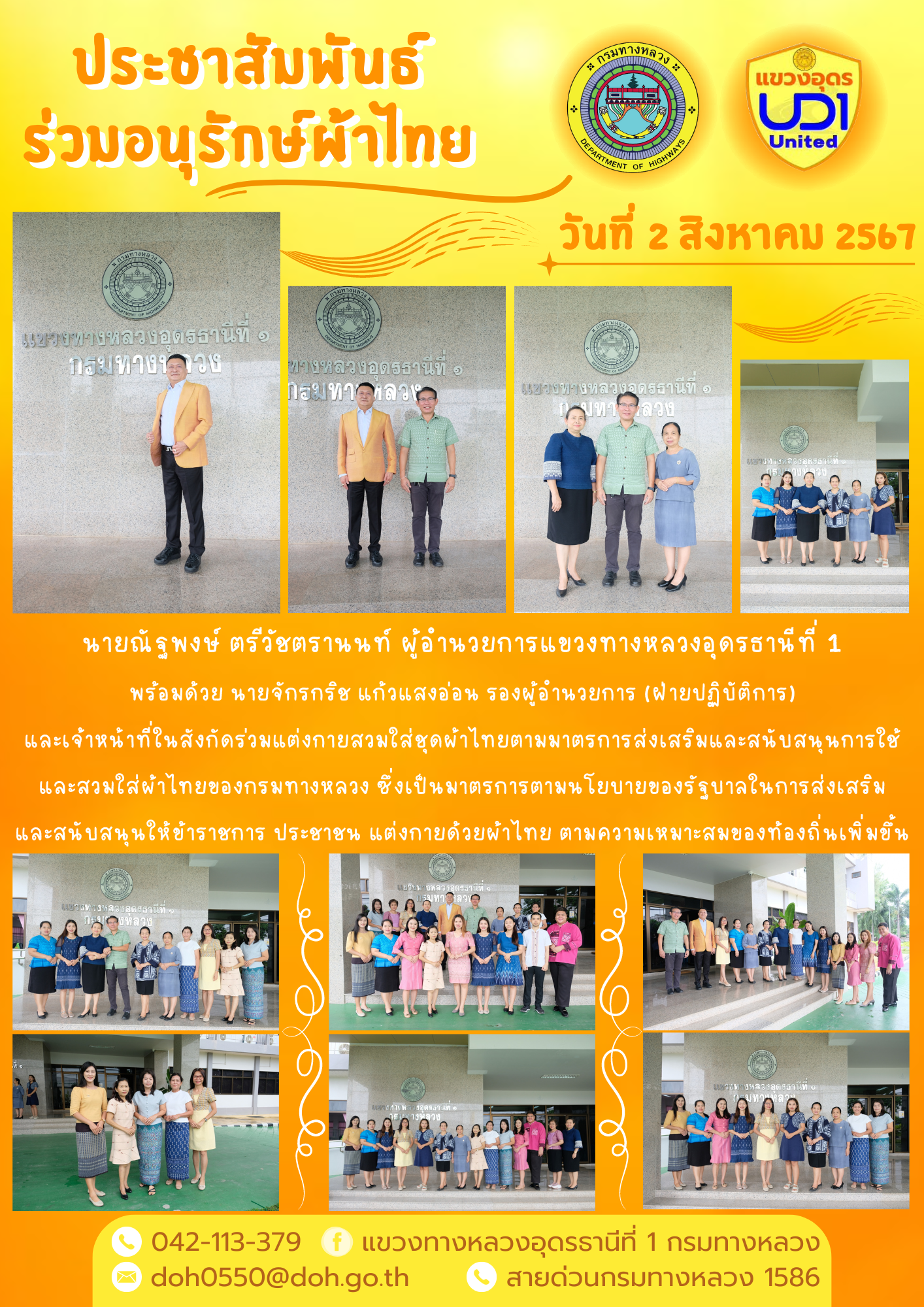 นายณัฐพงษ์ ตรีวัชตรานนท์ ผู้อำนวยการแขวงทางหลวงอุดรธานีที่ 1 พร้อมด้วย นายจักรกริช แก้วแสงอ่อน รองผู้อำนวยการ (ฝ่ายปฏิบัติการ) และเจ้าหน้าที่ในสังกัดร่วมแต่งกายสวมใส่ชุดผ้าไทยตามมาตรการส่งเสริมและสนับสนุนการใช้และสวมใส่ผ้าไทยของกรมทางหลวง ซึ่งเป็นมาตรการตามนโยบายของรัฐบาลในการส่งเสริมและสนับสนุนให้ข้าราชการ ประชาชน แต่งกายด้วยผ้าไทย ตามความเหมาะสมของท้องถิ่นเพิ่มขึ้น