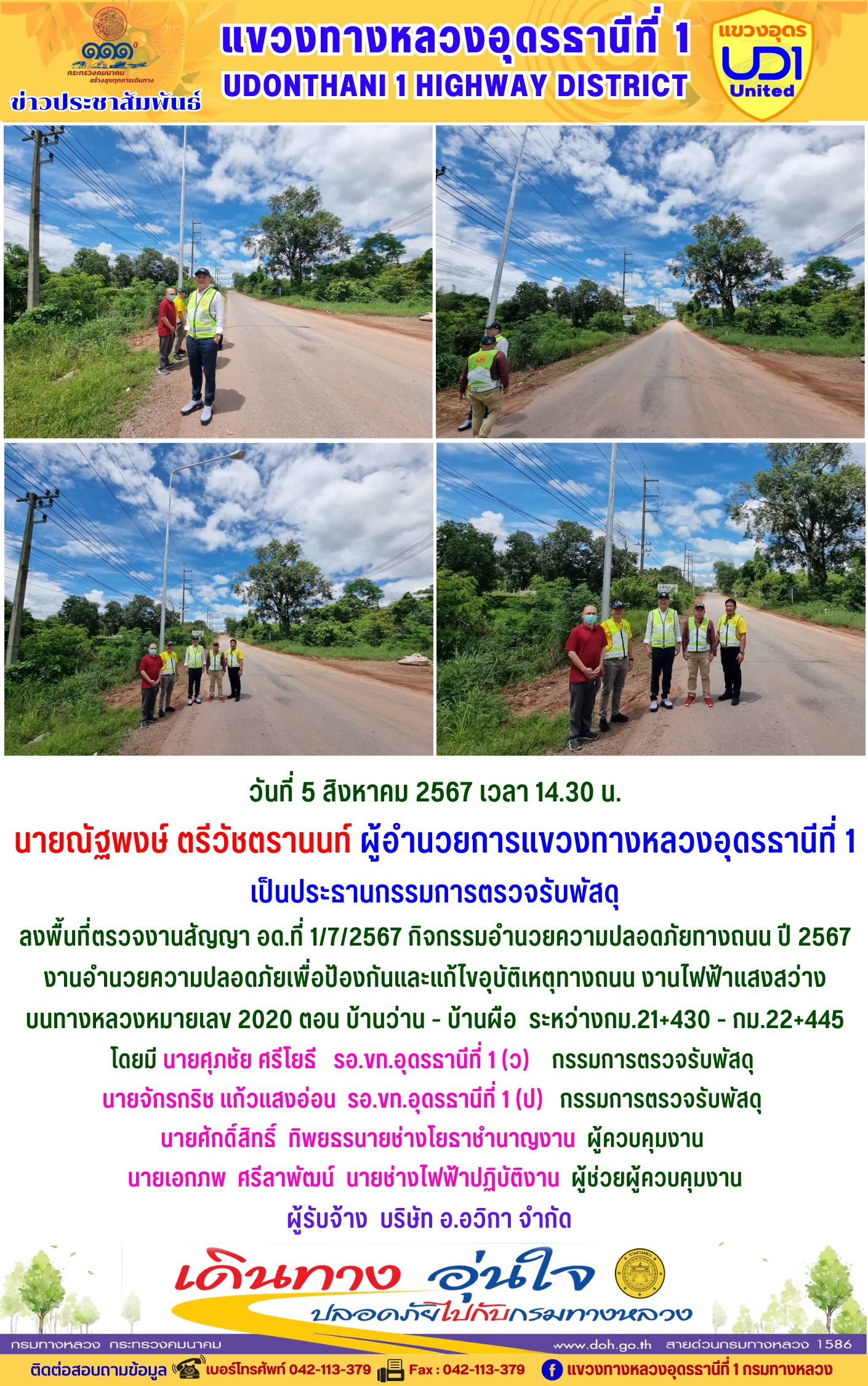 ตรวจงานสัญญา อด.ที่ 1/7/2567 กิจกรรมอำนวยความปลอดภัยทางถนน ปี 2567 งานอำนวยความปลอดภัยเพื่อป้องกันและแก้ไขอุบัติเหตุทางถนน งานไฟฟ้าแสงสว่าง บนทางหลวงหมายเลข 2020 ตอน บ้านว่าน - บ้านผือ ระหว่างกม.21+430 - กม.22+445