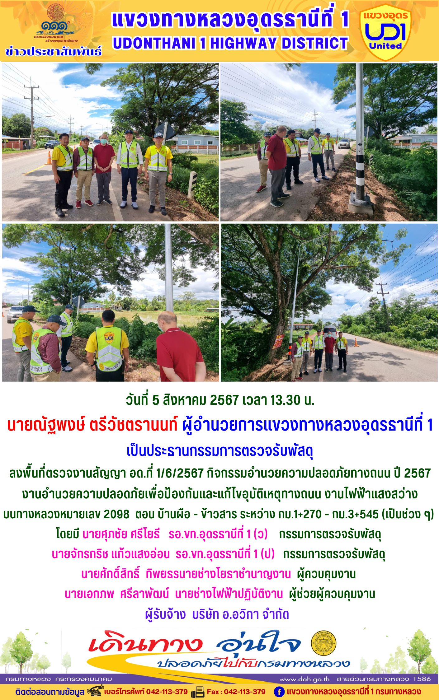 ตรวจงานสัญญา อด.ที่ 1/6/2567 กิจกรรมอำนวยความปลอดภัยทางถนน ปี 2567 งานอำนวยความปลอดภัยเพื่อป้องกันและแก้ไขอุบัติเหตุทางถนน งานไฟฟ้าแสงสว่าง บนทางหลวงหมายเลข 2098 ตอน บ้านผือ - ข้าวสาร ระหว่าง กม.1+270 - กม.3+545 (เป็นช่วง ๆ)