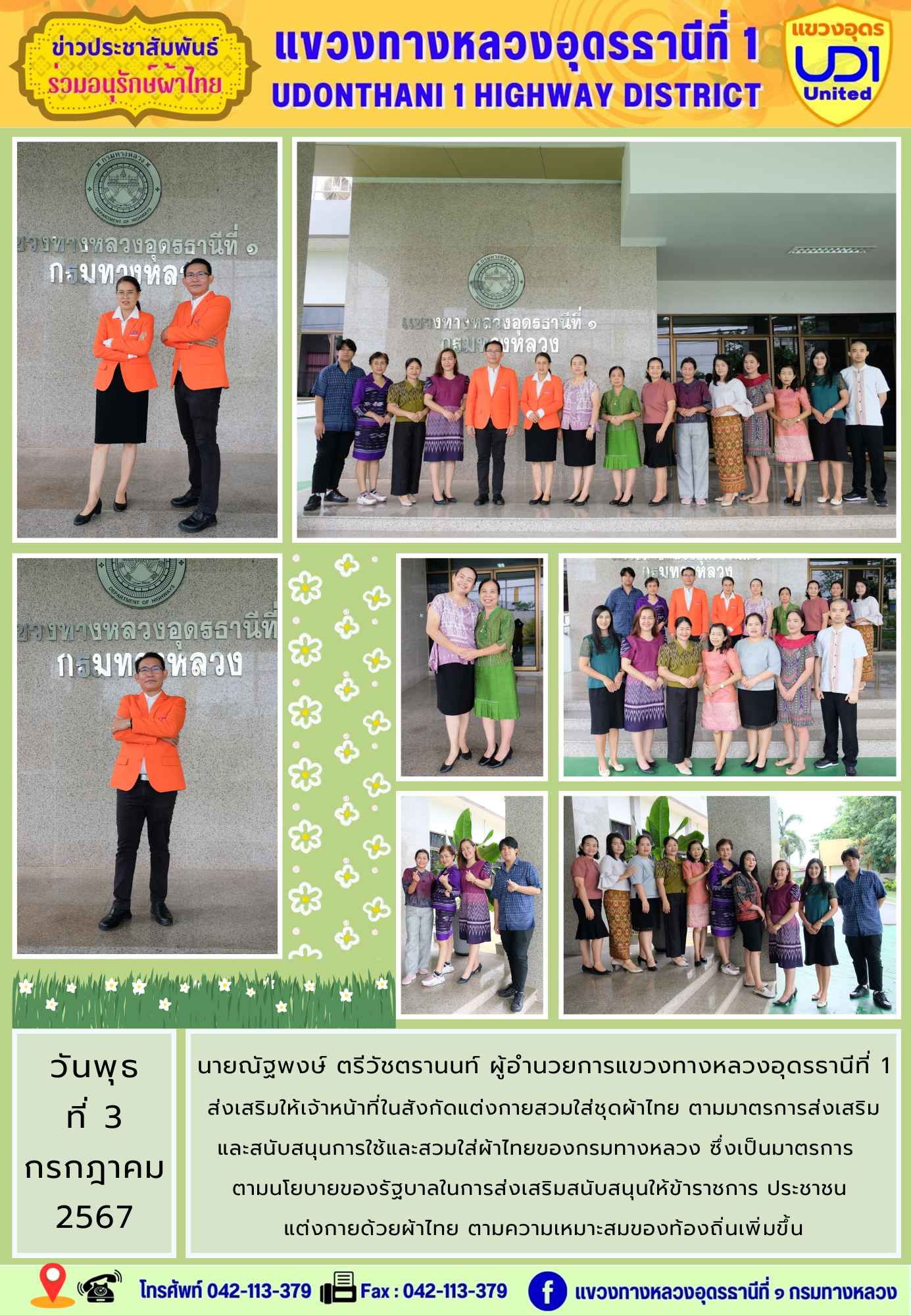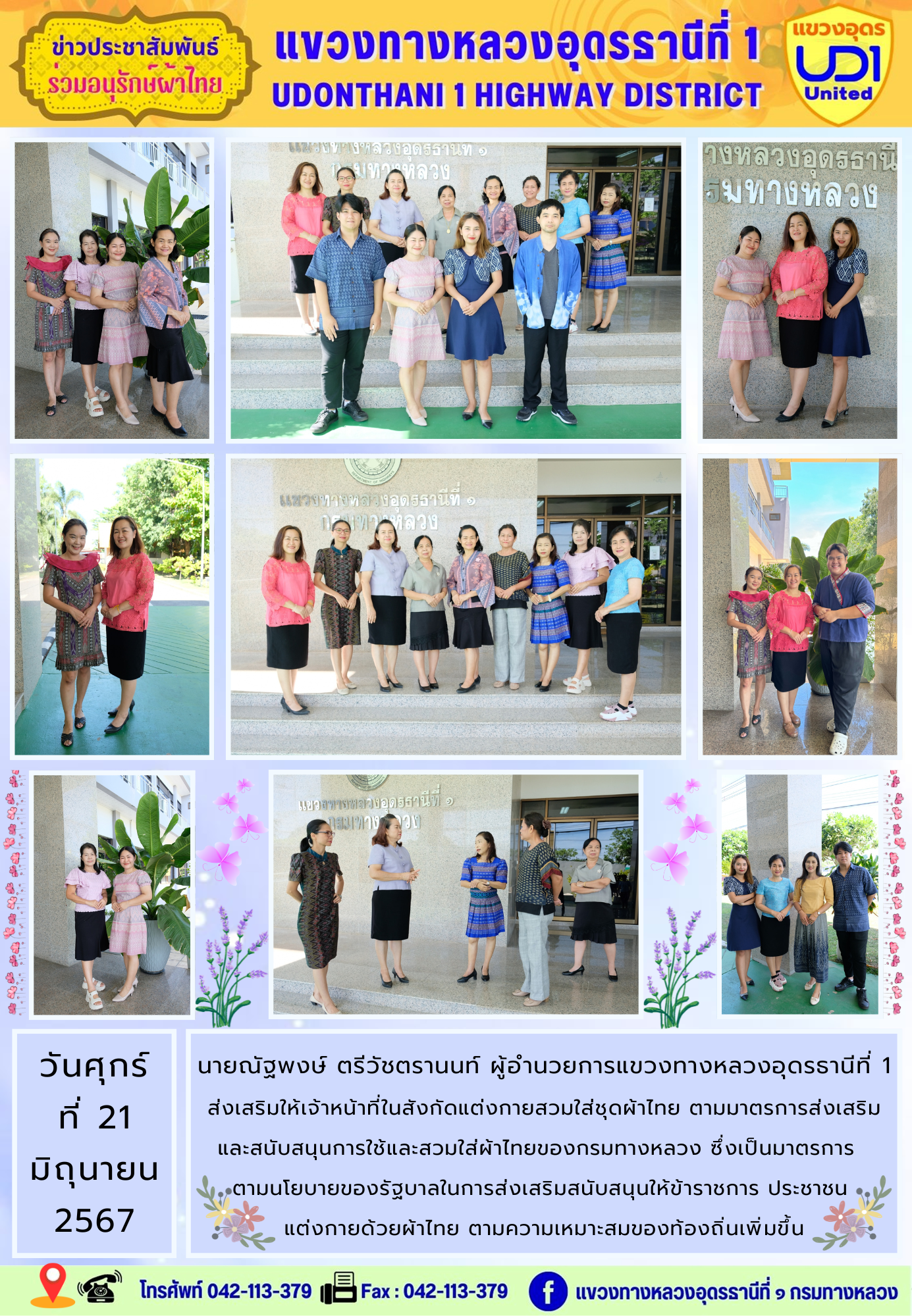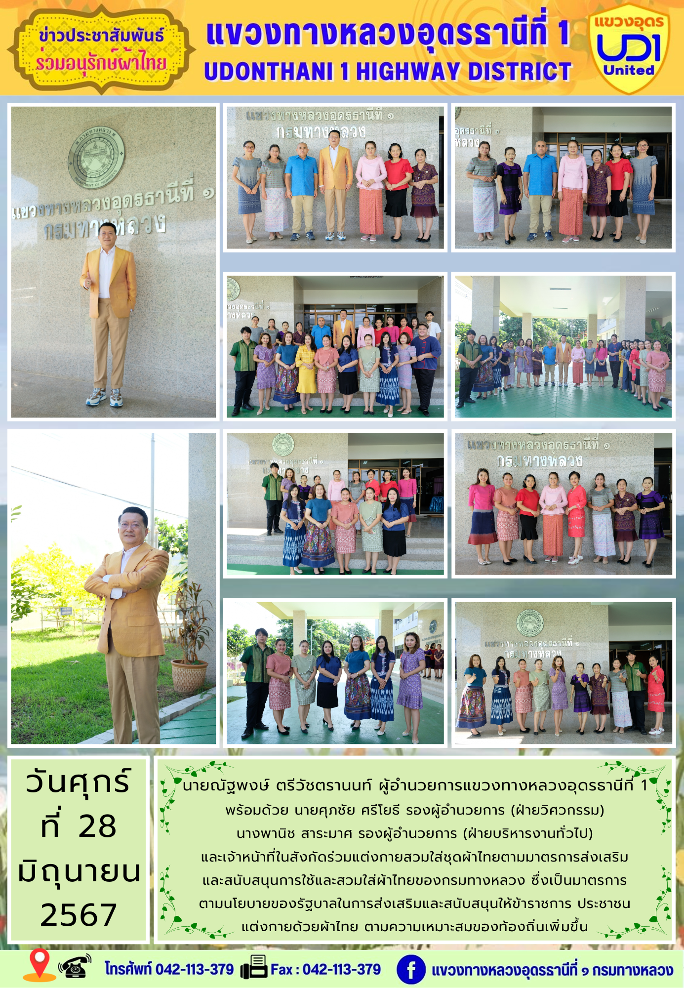 นายณัฐพงษ์ ตรีวัชตรานนท์ ผู้อำนวยการแขวงทางหลวงอุดรธานีที่ 1 พร้อมด้วย นายศุภชัย ศรีโยธี รองผู้อำนวยการ (ฝ่ายวิศวกรรม) นางพานิช สาระมาศ รองผู้อำนวยการ (ฝ่ายบริหารงานทั่วไป) นายจักรกริช แก้วแสงอ่อน รองผู้อำนวยการ (ฝ่ายปฏิบัติการ) และเจ้าหน้าที่ในสังกัดร่วมแต่งกายสวมใส่ชุดผ้าไทยตามมาตรการส่งเสริม และสนับสนุนการใช้และสวมใส่ผ้าไทยของกรมทางหลวง ซึ่งเป็นมาตรการตามนโยบายของรัฐบาลในการส่งเสริมและสนับสนุนให้ข้าราชการ ประชาชน แต่งกายด้วยผ้าไทย ตามความเหมาะสมของท้องถิ่นเพิ่มขึ้น