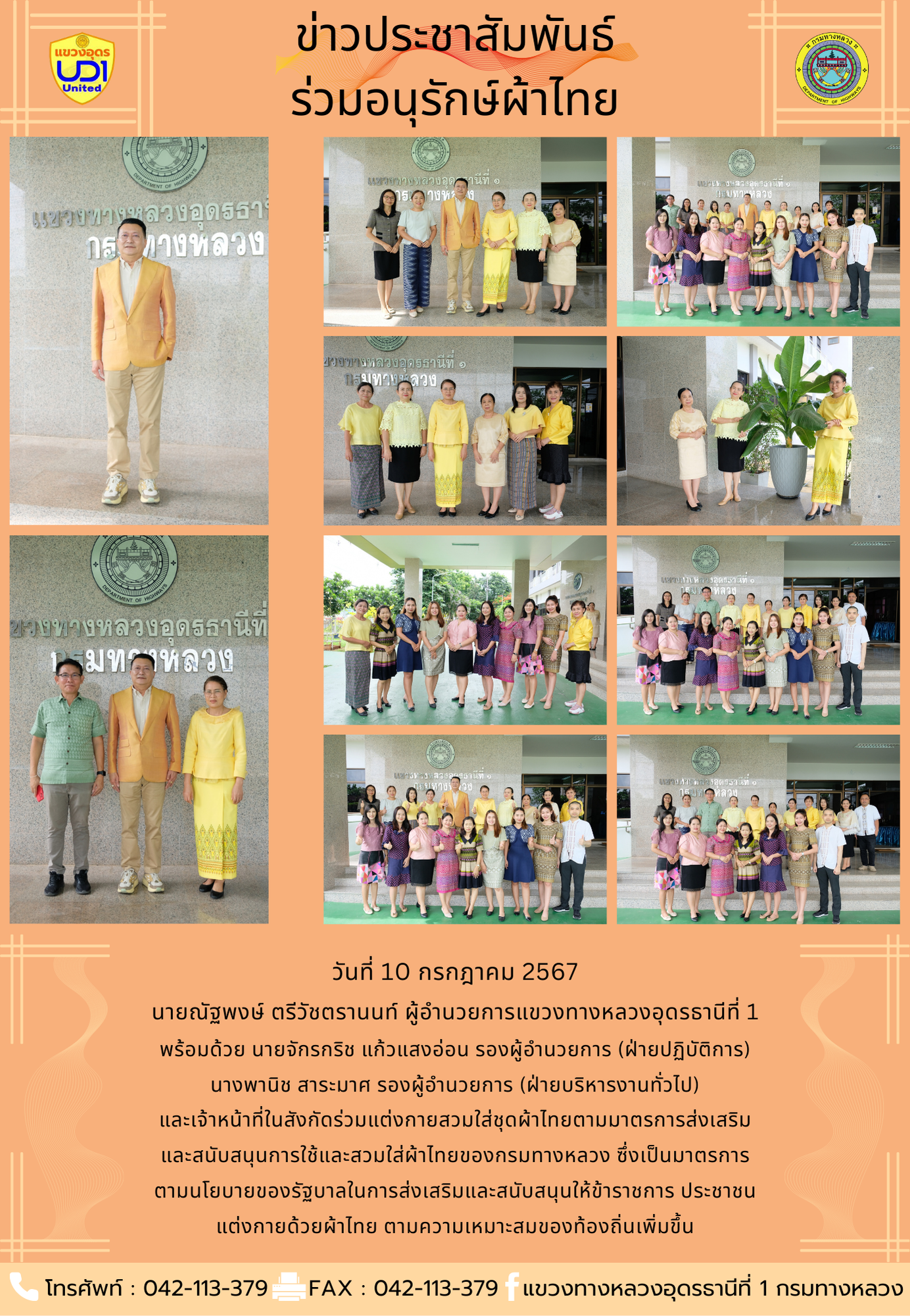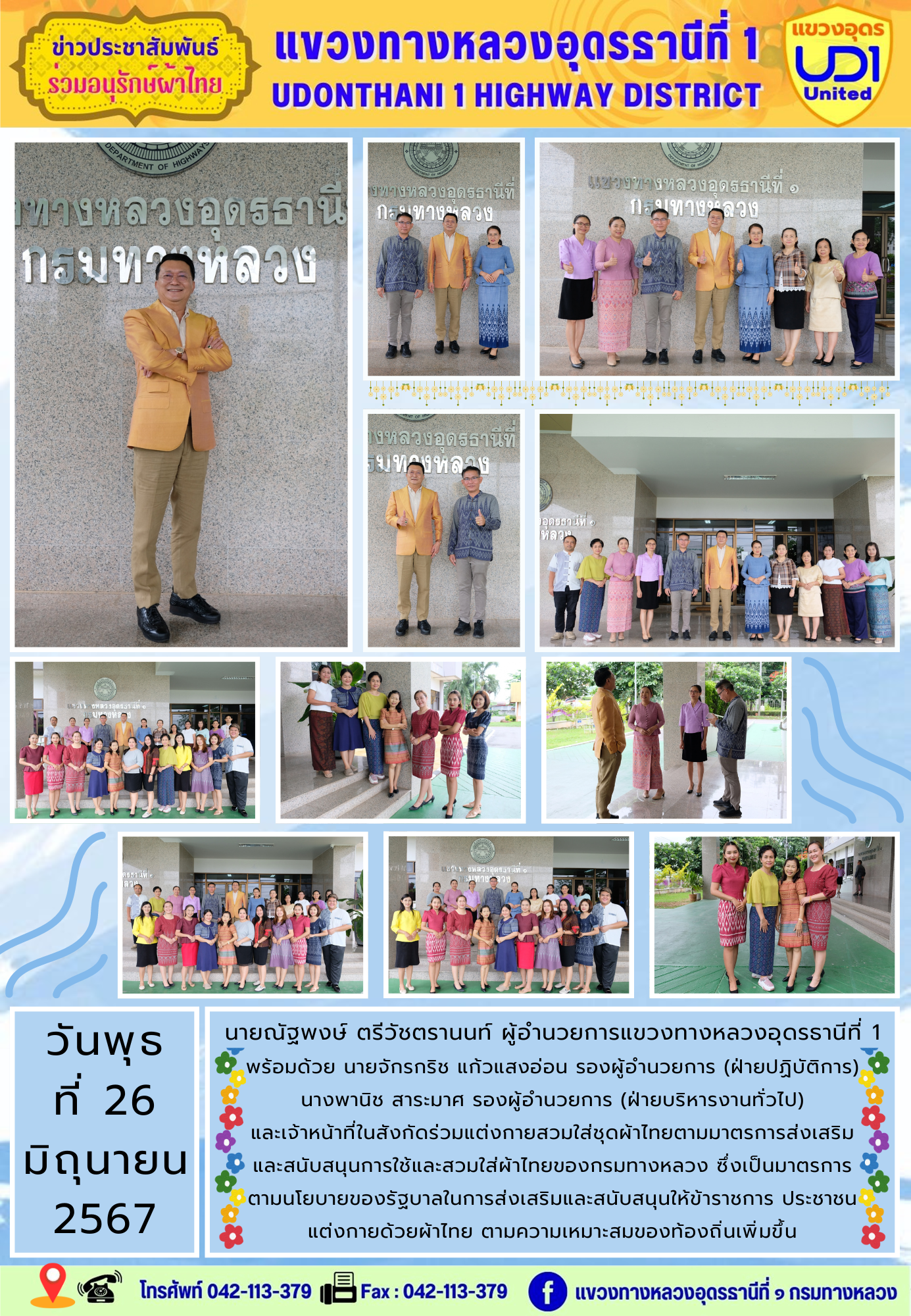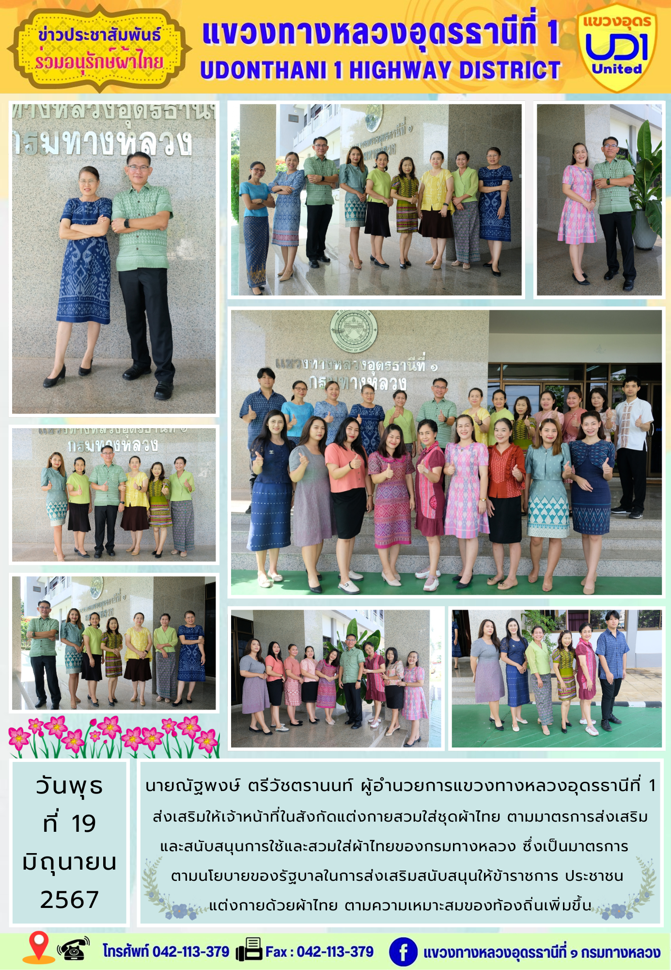 นายณัฐพงษ์ ตรีวัชตรานนท์ ผู้อำนวยการแขวงทางหลวงอุดรธานีที่ 1 พร้อมด้วย นายศุภชัย ศรีโยธี รองผู้อำนวยการ (ฝ่ายวิศวกรรม) นางพานิช สาระมาศ รองผู้อำนวยการ (ฝ่ายบริหารงานทั่วไป) นายจักรกริช แก้วแสงอ่อน รองผู้อำนวยการ (ฝ่ายปฏิบัติการ) และเจ้าหน้าที่ในสังกัดร่วมแต่งกายสวมใส่ชุดผ้าไทยตามมาตรการส่งเสริม และสนับสนุนการใช้และสวมใส่ผ้าไทยของกรมทางหลวง ซึ่งเป็นมาตรการตามนโยบายของรัฐบาลในการส่งเสริมและสนับสนุนให้ข้าราชการ ประชาชน แต่งกายด้วยผ้าไทย ตามความเหมาะสมของท้องถิ่นเพิ่มขึ้น
