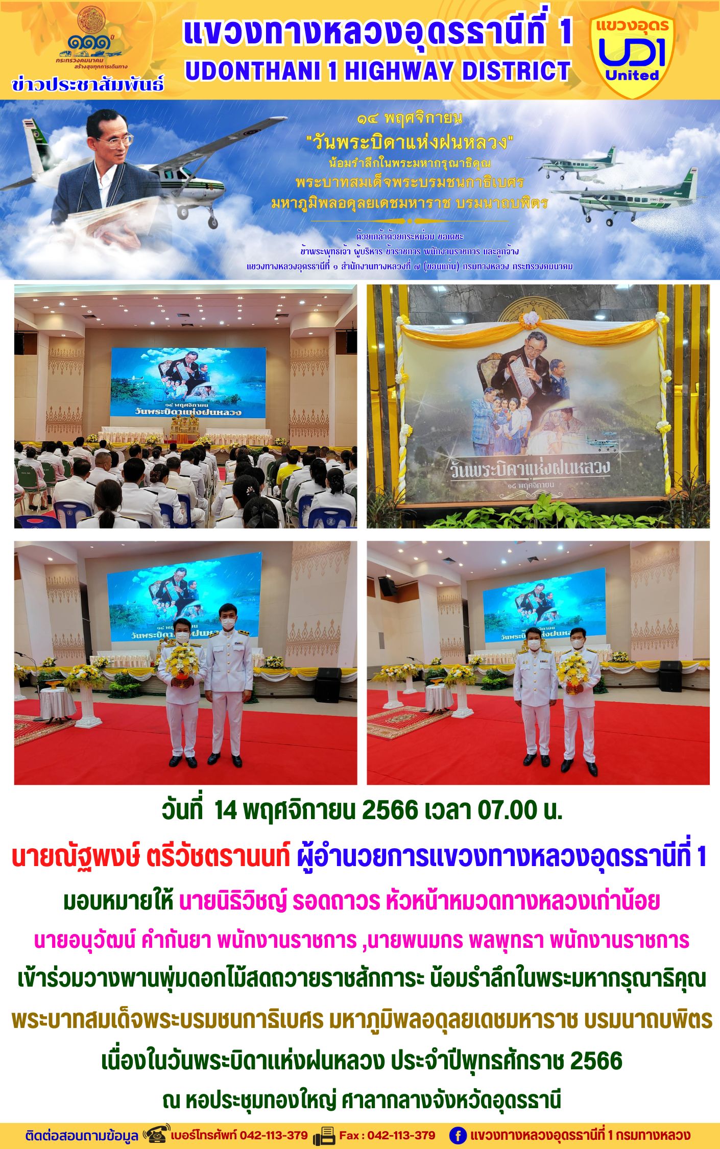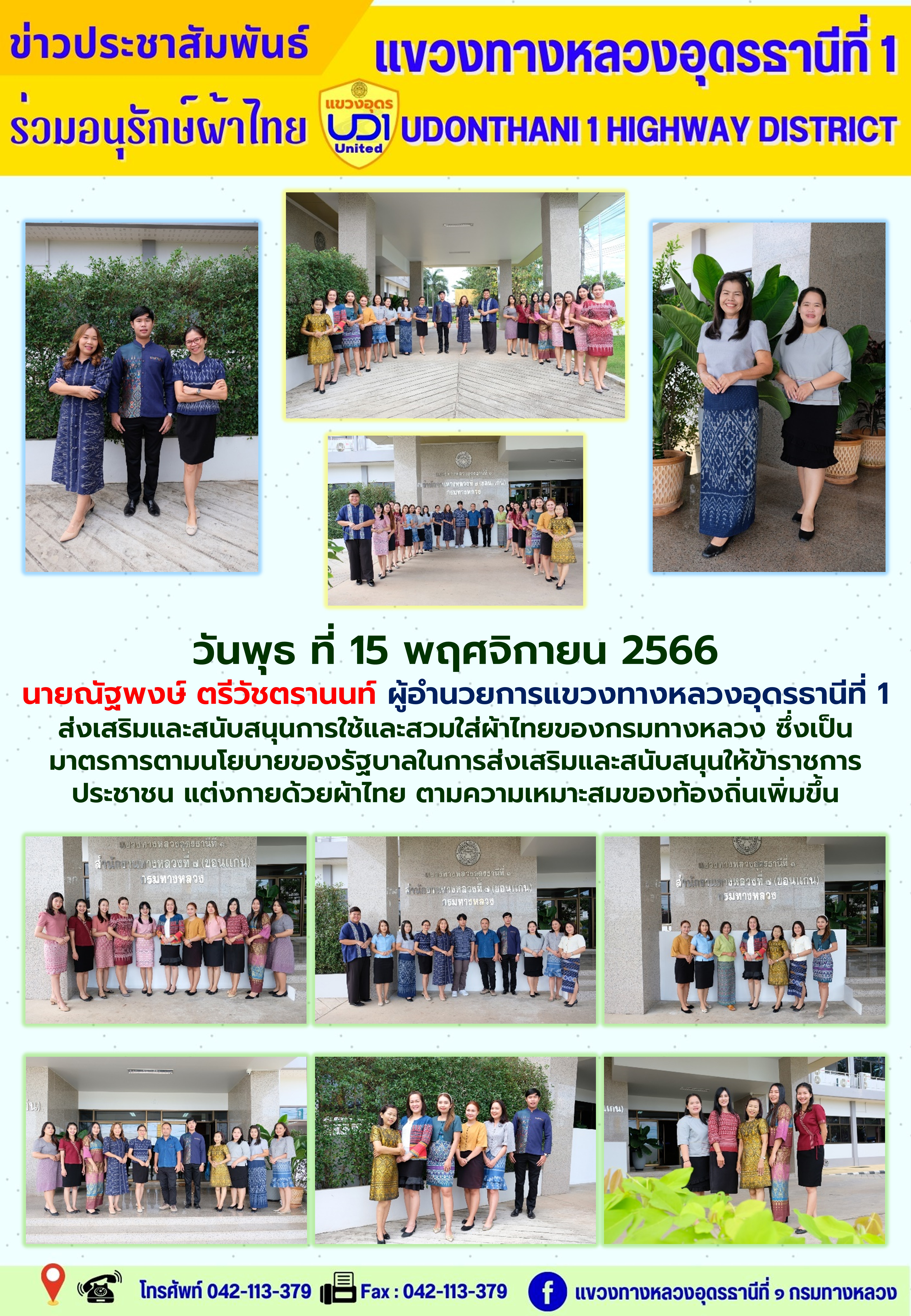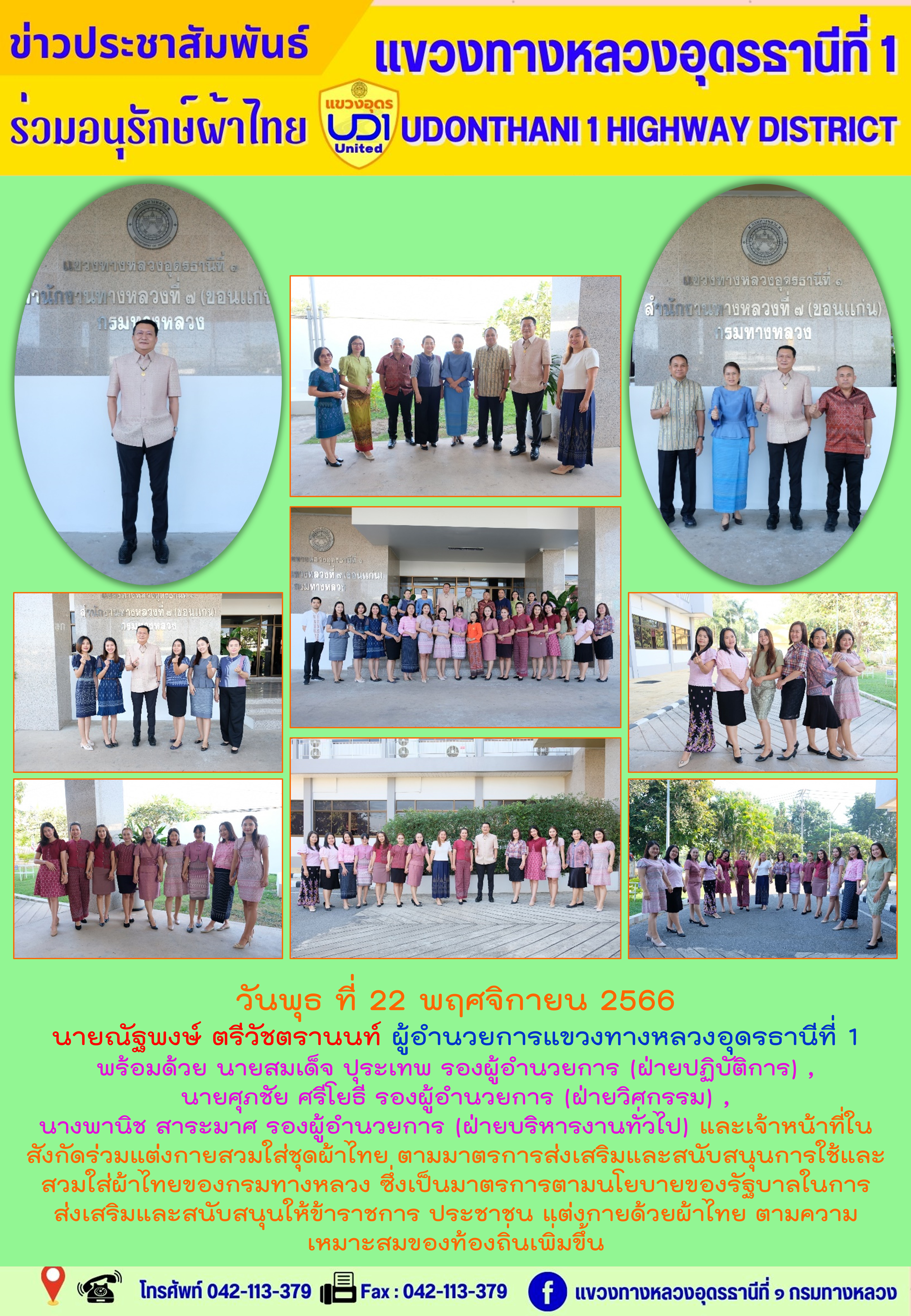 นายณัฐพงษ์ ตรีวัชตรานนท์ ผู้อำนวยการแขวงทางหลวงอุดรธานีที่ 1 พร้อมด้วย นายสมเด็จ ปุระเทพ รองผู้อำนวยการ (ฝ่ายปฏิบัติการ) , นายศุภชัย ศรีโยธี รองผู้อำนวยการ (ฝ่ายวิศกรรม) , นางพานิช สาระมาศ รองผู้อำนวยการ (ฝ่ายบริหารงานทั่วไป) และเจ้าหน้าที่ในสังกัดร่วมแต่งกายสวมใส่ชุดผ้าไทย ตามมาตรการส่งเสริมและสนับสนุนการใช้และสวมใส่ผ้าไทยของกรมทางหลวง ซึ่งเป็นมาตรการตามนโยบายของรัฐบาลในการส่งเสริมและสนับสนุนให้ข้าราชการ ประชาชน แต่งกายด้วยผ้าไทย ตามความเหมาะสมของท้องถิ่นเพิ่มขึ้น