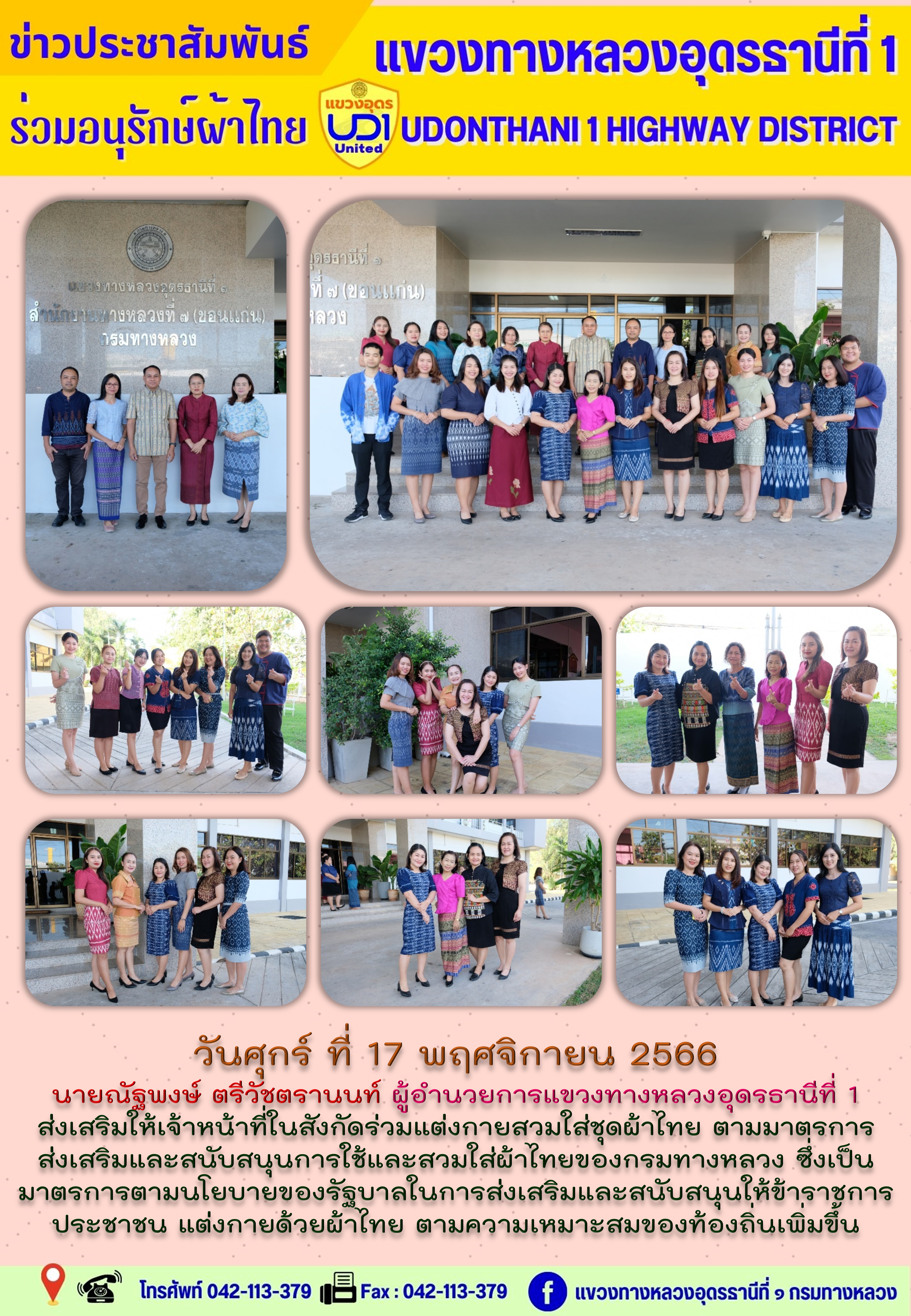 นายณัฐพงษ์ ตรีวัชตรานนท์ ผู้อำนวยการแขวงทางหลวงอุดรธานีที่ 1 ส่งเสริมและสนับสนุนการใช้และสวมใส่ผ้าไทยของกรมทางหลวง ซึ่งเป็นมาตรการตามนโยบายของรัฐบาลในการส่งเสริมและสนับสนุนให้ข้าราชการ ประชาชน แต่งกายด้วยผ้าไทย ตามความเหมาะสมของท้องถิ่นเพิ่มขึ้น