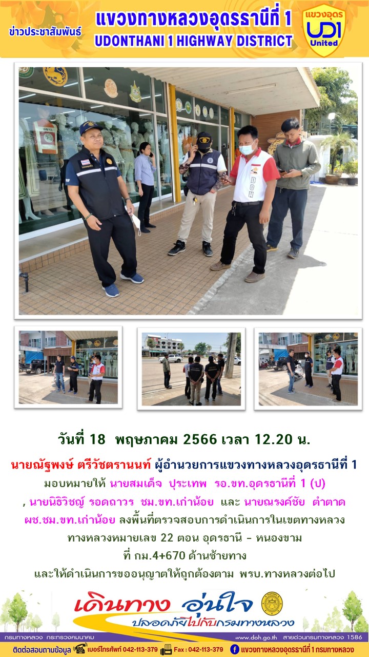 นายณัฐพงษ์ ตรีวัชตรานนท์ ผู้อำนวยการแขวงทางหลวงอุดรธานีที่ 1 มอบหมายให้ นายสมเด็จ ปุระเทพ รอ.ขท.อุดรธานีที่ 1 (ป) และ นายนิธิวิชญ์ รอดถาวร ชม.ขท.เก่าน้อย ลงพื้นที่ตรวจสอบการดำเนินการในเขตทางหลวง ทางหลวงหมายเลข 22 ตอน อุดรธานี – หนองขาม ที่ กม. 4+670 ด้านซ้ายทาง และแจ้งให้ ขออนุญาตให้ถูกต้อง ตาม พรบ.ทางหลวง