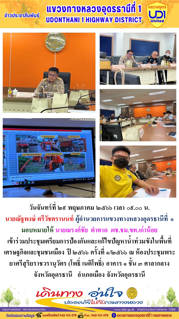 นายณัฐพงษ์ ตรีวัชตรานนท์ ผู้อำนวยการแขวงทางหลวงอุดรธานีที่ 1 มอบหมายให้ นายสมเด็จ ปุระเทพ รอ.ขท.อุดรธานีที่ 1 (ป) ร่วมประชุมกรมการจังหวัดและหัวหน้าส่วนราชการประจำจังหวัดอุดรธานี ประจำเดือนพฤษภาคม 2566 ณ ห้องประชุมกรมหลวงประจักษ์ศิลปาคม อาคาร 1 ชั้น 5 ศาลากลางจังหวัดอุดรธานี