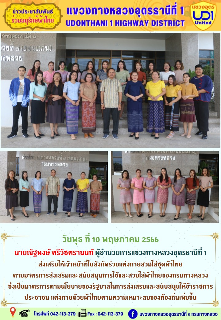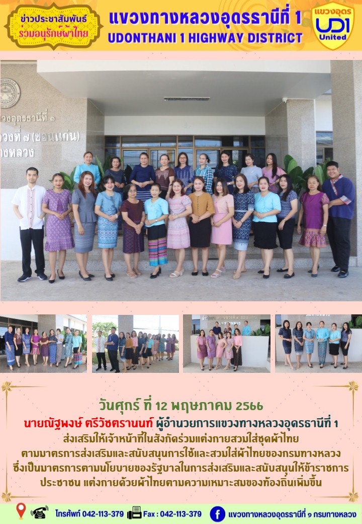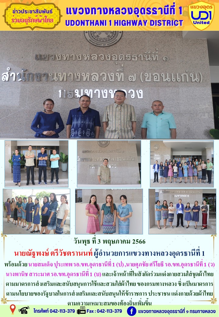 นายณัฐพงษ์ ตรีวัชตรานนท์ ผู้อำนวยการแขวงทางหลวงอุดรธานีที่ 1 พร้อมด้วย นายสมเด็จ ปุระเทพ รอ.ขท.อุดรธานีที่ 1 (ป) ,นายศุภชัย ศรีโยธี รอ.ขท.อุดรธานีที่ 1 (ว) นางพานิช สาระมาศ รอ.ขท.อุดรธานีที่ 1 (บ) และเจ้าหน้าที่ในสังกัดร่วมแต่งกายสวมใส่ชุดผ้าไทยตามมาตรการส่งเสริมและสนับสนุนการใช้และสวมใส่ผ้าไทย ของกรมทางหลวง