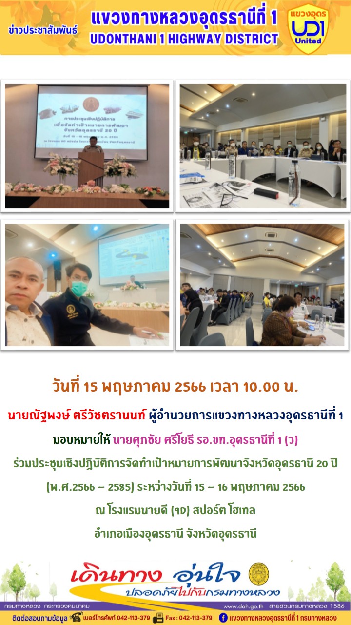 นายณัฐพงษ์ ตรีวัชตรานนท์ ผู้อำนวยการแขวงทางหลวงอุดรธานีที่ 1 มอบหมายให้ นายศุภชัย ศรีโยธี รอ.ขท.อุดรธานีที่ 1 (ว) ร่วมประชุมเชิงปฏิบัติการจัดทำเป้าหมายการพัฒนาจังหวัดอุดรธานี 20 ปี (พ.ศ.2566 - 2585) ระหว่างวันที่ 15 - 16 พฤษภาคม 2566 ณ โรงแรมนายดี (9D) สปอร์ต โฮเทล อำเภอเมืองอุดรธานี จังหวัดอุดรธานี