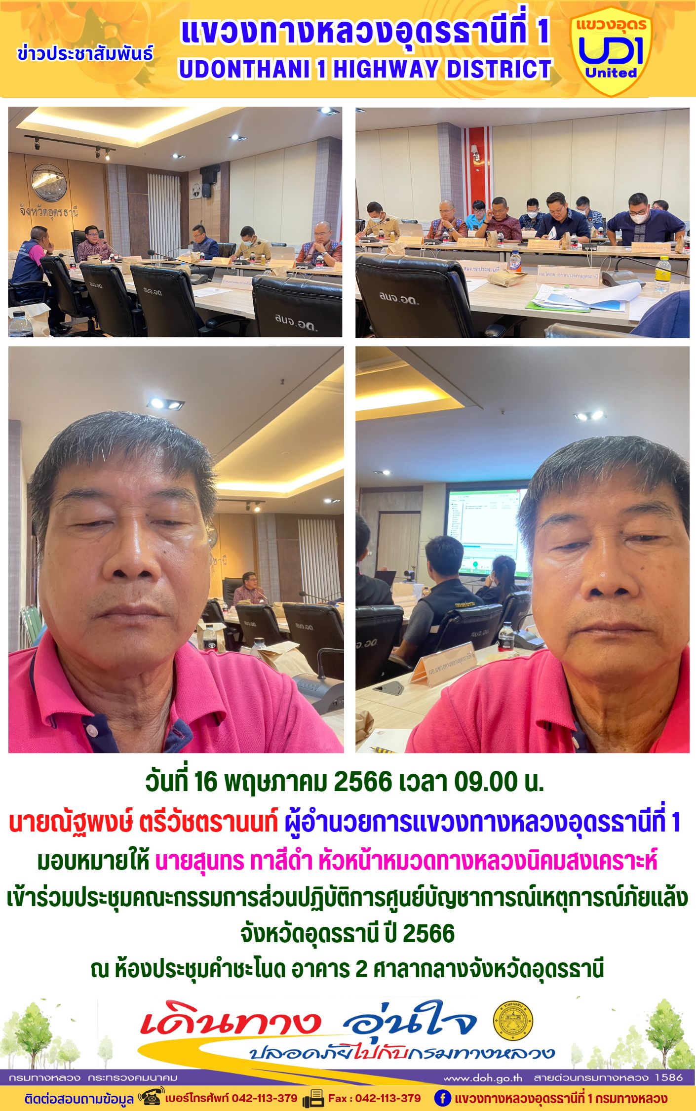 นายณัฐพงษ์ ตรีวัชตรานนท์ ผู้อำนวยการแขวงทางหลวงอุดรธานีที่ 1 มอบหมายให้ นายศุภชัย ศรีโยธี รอ.ขท.อุดรธานีที่ 1 (ว) ร่วมประชุมคณะทำงานย่อยจัดงานมหกรรมพืชสวนโลกจังหวัดอุดรธานี พ.ศ.2569 ครั้งที่ 2/2566 ณ ห้องประชุมพระยาศรีสุริยราชวรานุวัตร (โพธิ์ เนติโพธิ์) ชั้น 3 อาคาร 1 ศาลากลางจังหวัดอุดรธานี