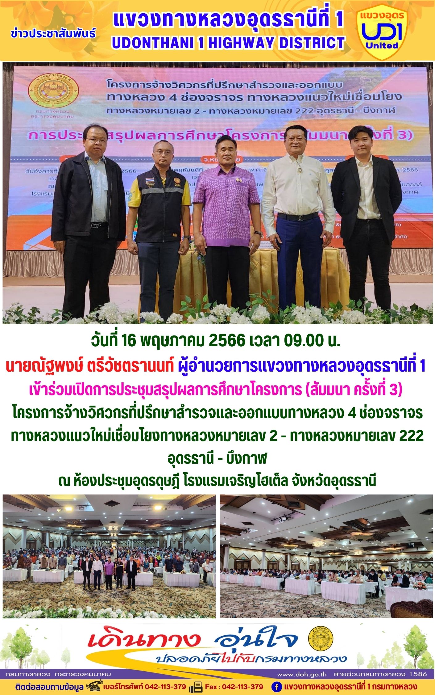 เข้าร่วมเปิดการประชุมสรุปผลการศึกษาโครงการ (สัมมนา ครั้งที่ 3) โครงการจ้างวิศวกรที่ปรึกษาสำรวจและออกแบบทางหลวง 4 ช่องจราจร ทางหลวงแนวใหม่เชื่อมโยงทางหลวงหมายเลข 2 - ทางหลวงหมายเลข 222 อุดรธานี - บึงกาฬ