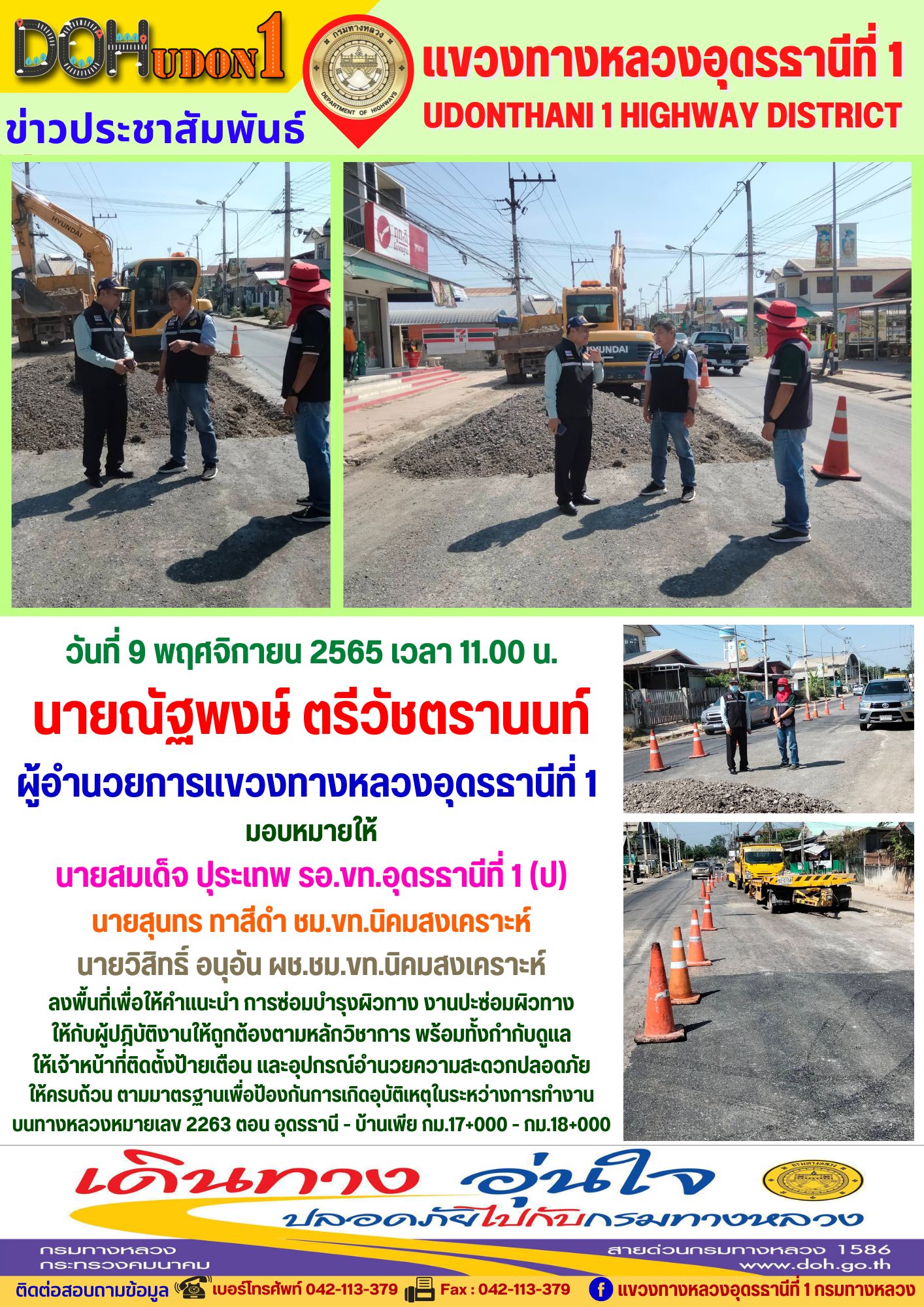 นายณัฐพงษ์ ตรีวัชตรานนท์ ผู้อำนวยการแขวงทางหลวงอุดรธานีที่ 1 มอบหมายให้ นายสมเด็จ ปุระเทพ รอ.ขท.อุดรธานีที่ 1 (ป) นายสุนทร ทาสีดำ ชม.ขท.นิคมสงเคราะห์ นายวิสิทธิ์ อนุอัน ผช.ชม.ขท.นิคมสงเคราะห์ ลงพื้นที่เพื่อให้คำแนะนำ การซ่อมบำรุงผิวทาง งานปะซ่อมผิวทาง ให้กับผู้ปฎิบัติงาน
