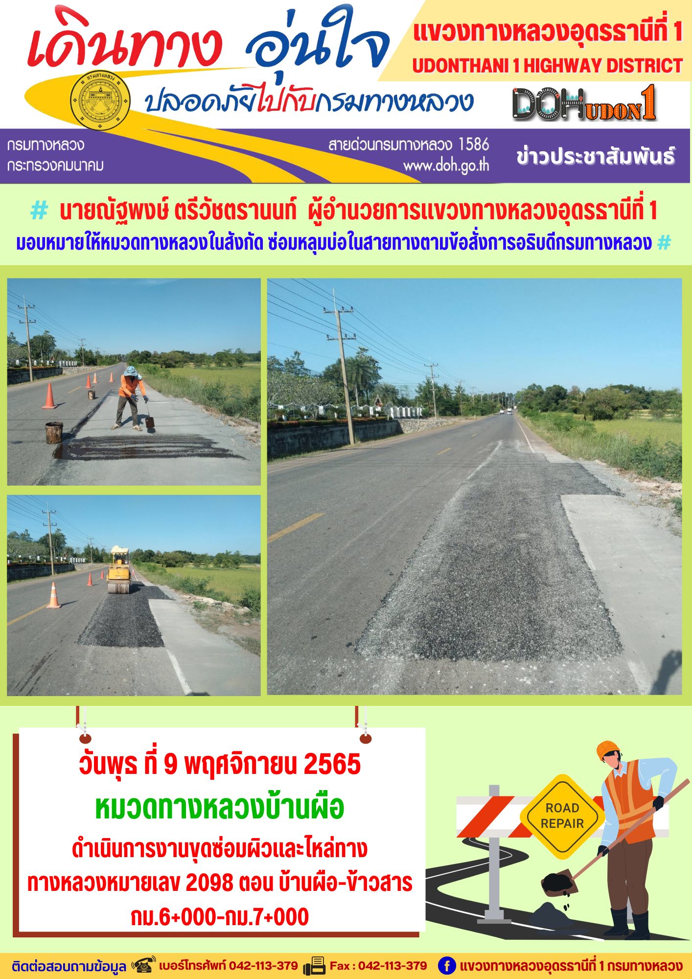 นายณัฐพงษ์ ตรีวัชตรานนท์ ผู้อำนวยการแขวงทางหลวงอุดรธานีที่ 1 มอบหมายให้หมวดทางหลวงในสังกัด ซ่อมหลุมบ่อในสายทางตามข้อสั่งการอธิบดีกรมทางหลวง