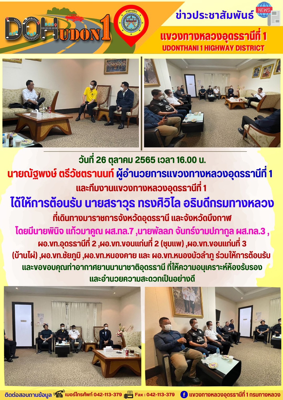 นายณัฐพงษ์ ตรีวัชตรานนท์ ผู้อำนวยการแขวงทางหลวงอุดรธานีที่ 1 และทีมงานแขวงทางหลวงอุดรธานีที่ 1 ได้ให้การต้อนรับ นายสราวุธ ทรงศิวิไล อธิบดีกรมทางหลวง ที่เดินทางมาราชการจังหวัดอุดรธานี และจังหวัดบึงกาฬ