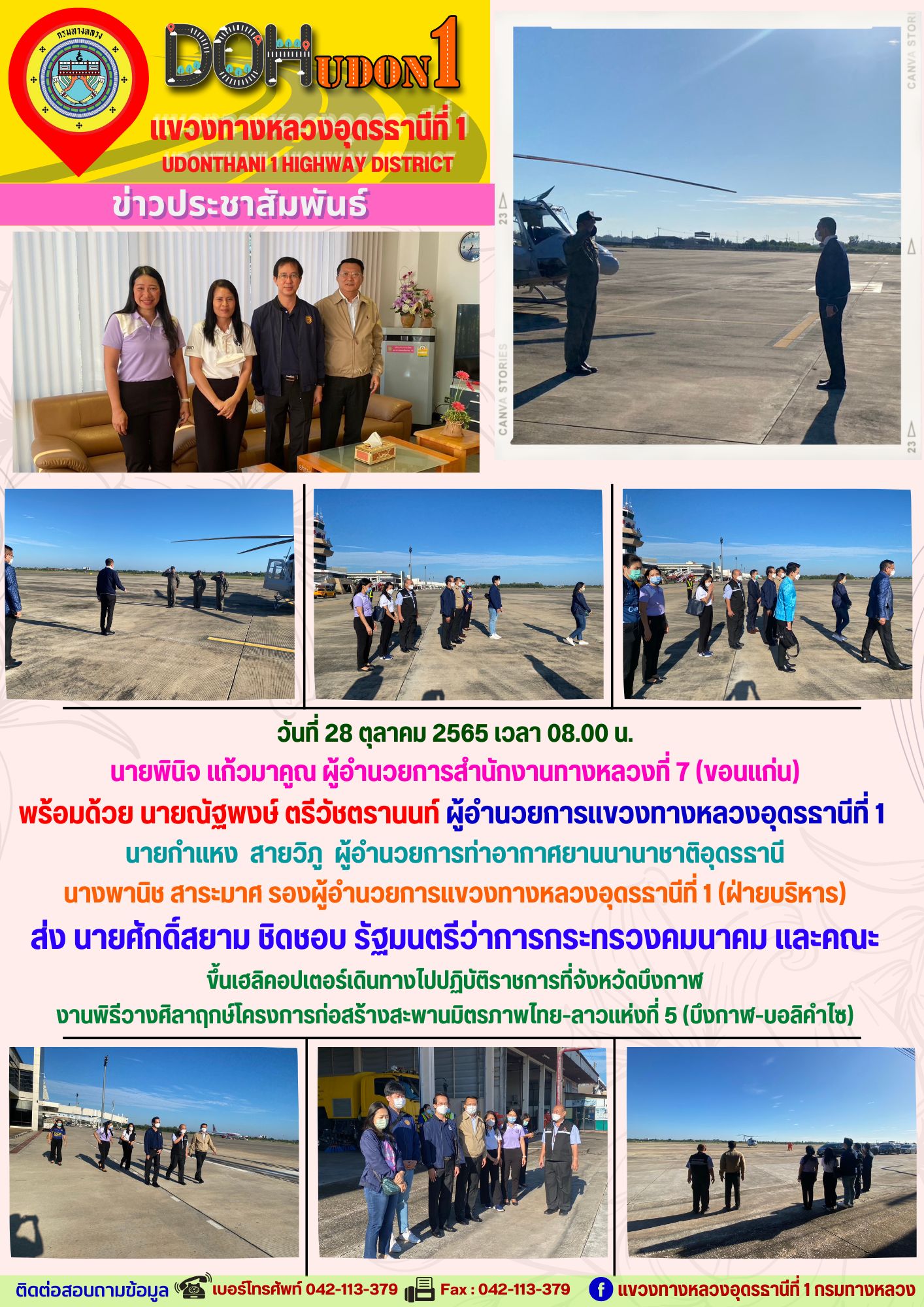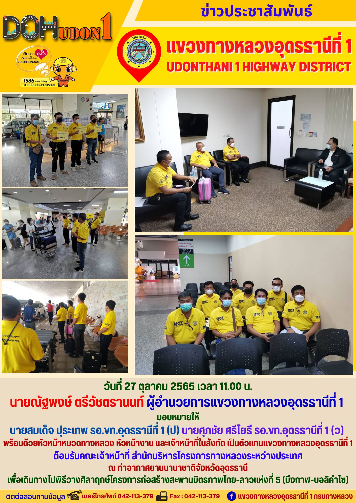 นายณัฐพงษ์ ตรีวัชตรานนท์ ผู้อำนวยการแขวงทางหลวงอุดรธานีที่ 1 มอบหมายให้ นายสมเด็จ ปุระเทพ รอ.ขท.อุดรธานีที่ 1 (ป) นายศุภชัย ศรีโยธี รอ.ขท.อุดรธานีที่ 1 (ว) พร้อมด้วยหัวหน้าหมวดทางหลวง หัวหน้างาน และเจ้าหน้าที่ในสังกัด เป็นตัวแทนแขวงทางหลวงอุดรธานีที่ 1 ต้อนรับคณะเจ้าหน้าที่ สำนักบริหารโครงการทางหลวงระหว่างประเทศ ณ ท่าอากาศยานนานาชาติจังหวัดอุดรธานี เพื่อเดินทางไปพิธีวางศิลาฤกษ์โครงการก่อสร้างสะพานมิตรภาพไทย-ลาวแห่งที่ 5 (บึงกาฬ-บอลิคำไซ)
