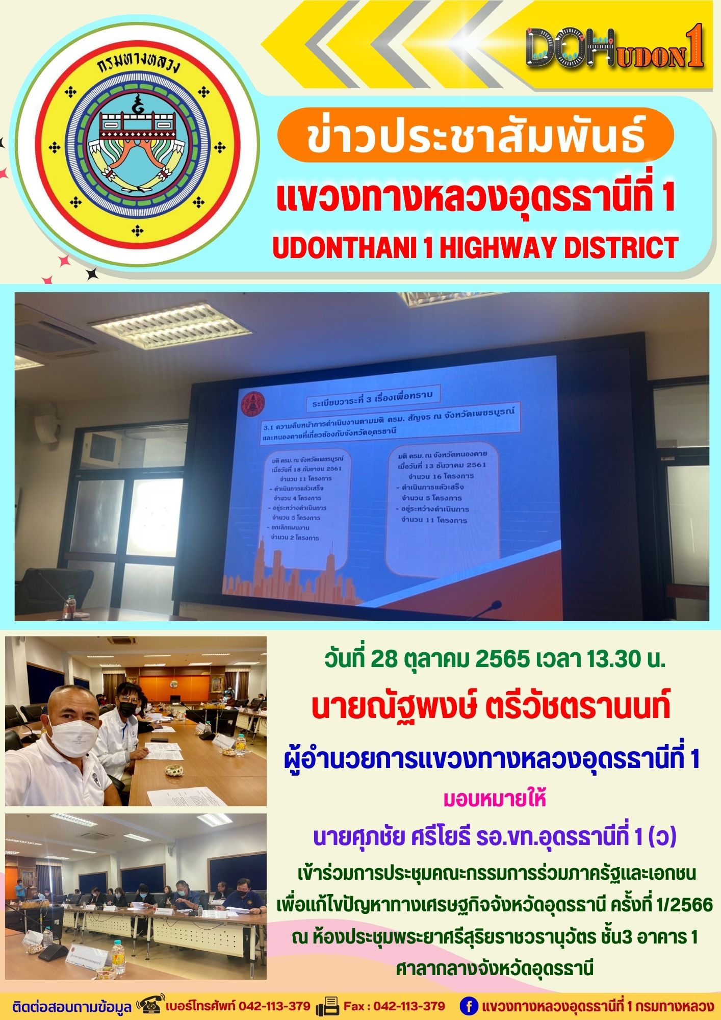 นายณัฐพงษ์ ตรีวัชตรานนท์ ผู้อำนวยการแขวงทางหลวงอุดรธานีที่ 1 มอบหมายให้ นายณรงค์ชัย ตำตาด ผู้ช่วยหมวดทางหลวงเก่าน้อย เข้าร่วมประชุมคณะกรรมการรักษาความสงบเรียบร้อยจังหวัดอุดรธานี ครั้งที่ 8/2565