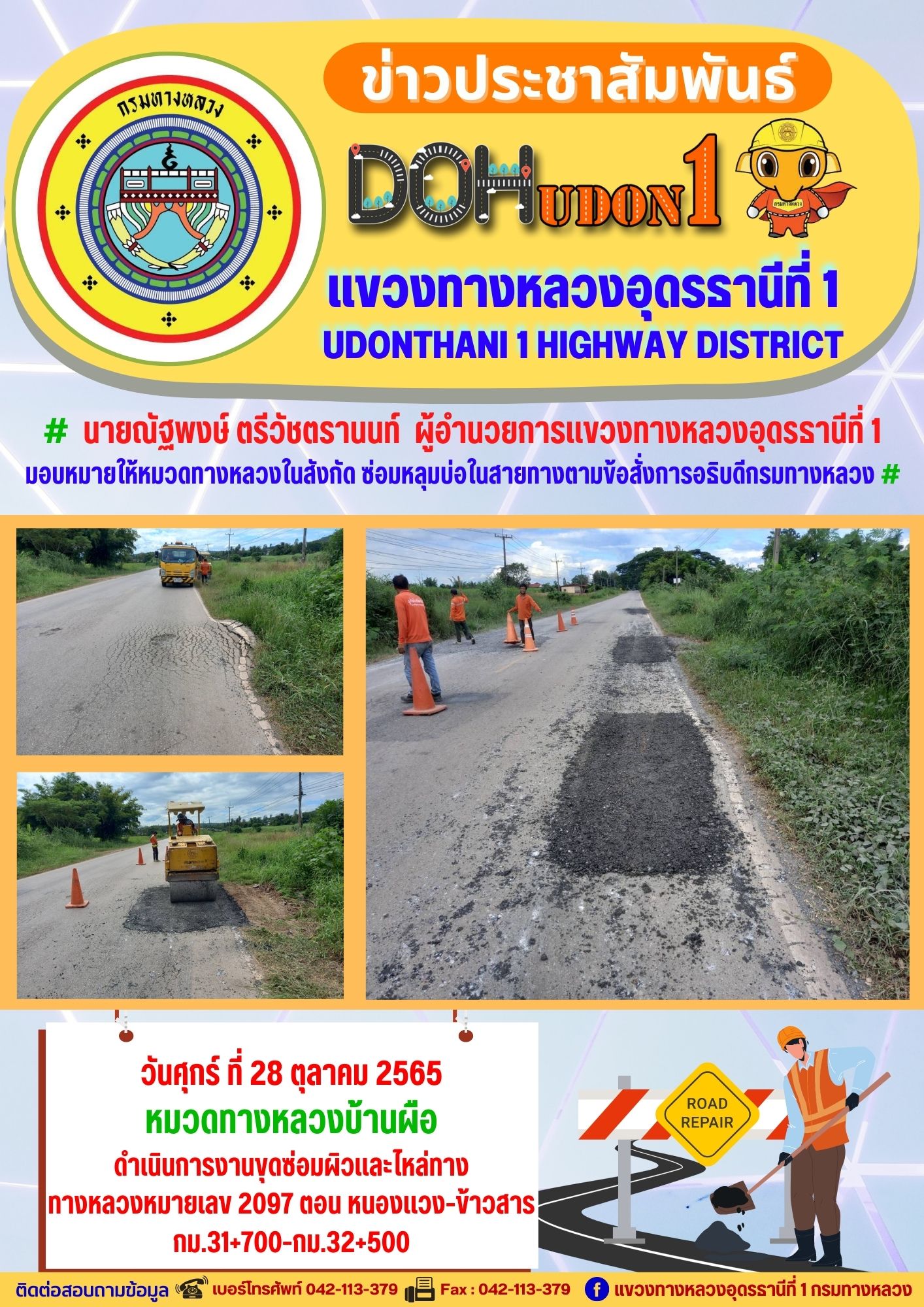 นายณัฐพงษ์ ตรีวัชตรานนท์ ผู้อำนวยการแขวงทางหลวงอุดรธานีที่ 1 มอบหมายให้ นายสมเด็จ ปุระเทพ รอ.ขท.อุดรธานีที่ 1 (ป) ลงพื้นที่เพื่อให้คำแนะนำ การซ่อมบำรุงผิวทาง งานปะซ่อมผิวทาง ให้กับผู้ปฎิบัติงาน