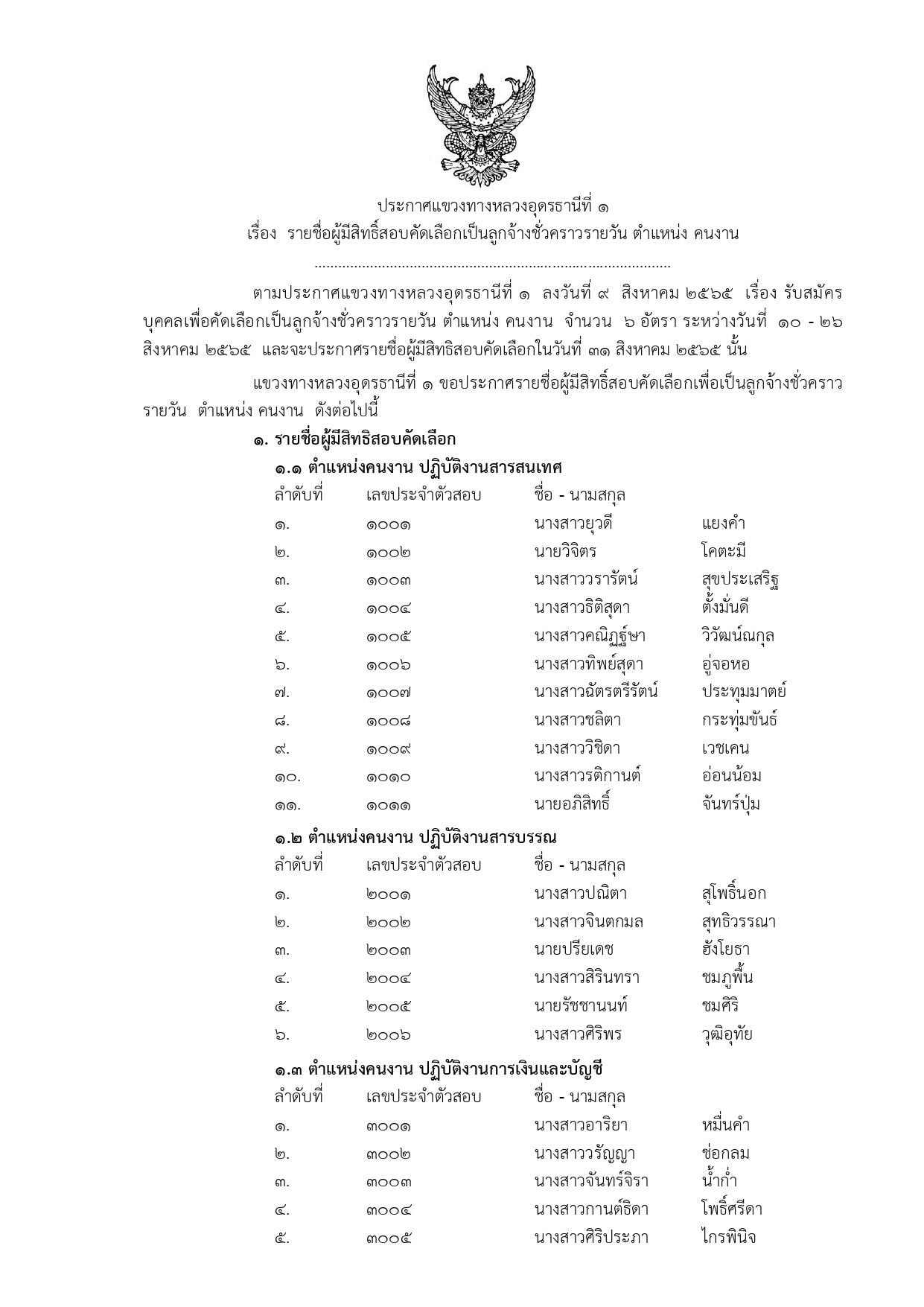 ประกาศแขวงทางหลวงอุดรธานีที่ ๑ เรื่อง รายชื่อผู้มีสิทธิ์สอบคัดเลือกเป็นลูกจ้างชั่วคราวรายวัน ตำแหน่ง คนงาน
