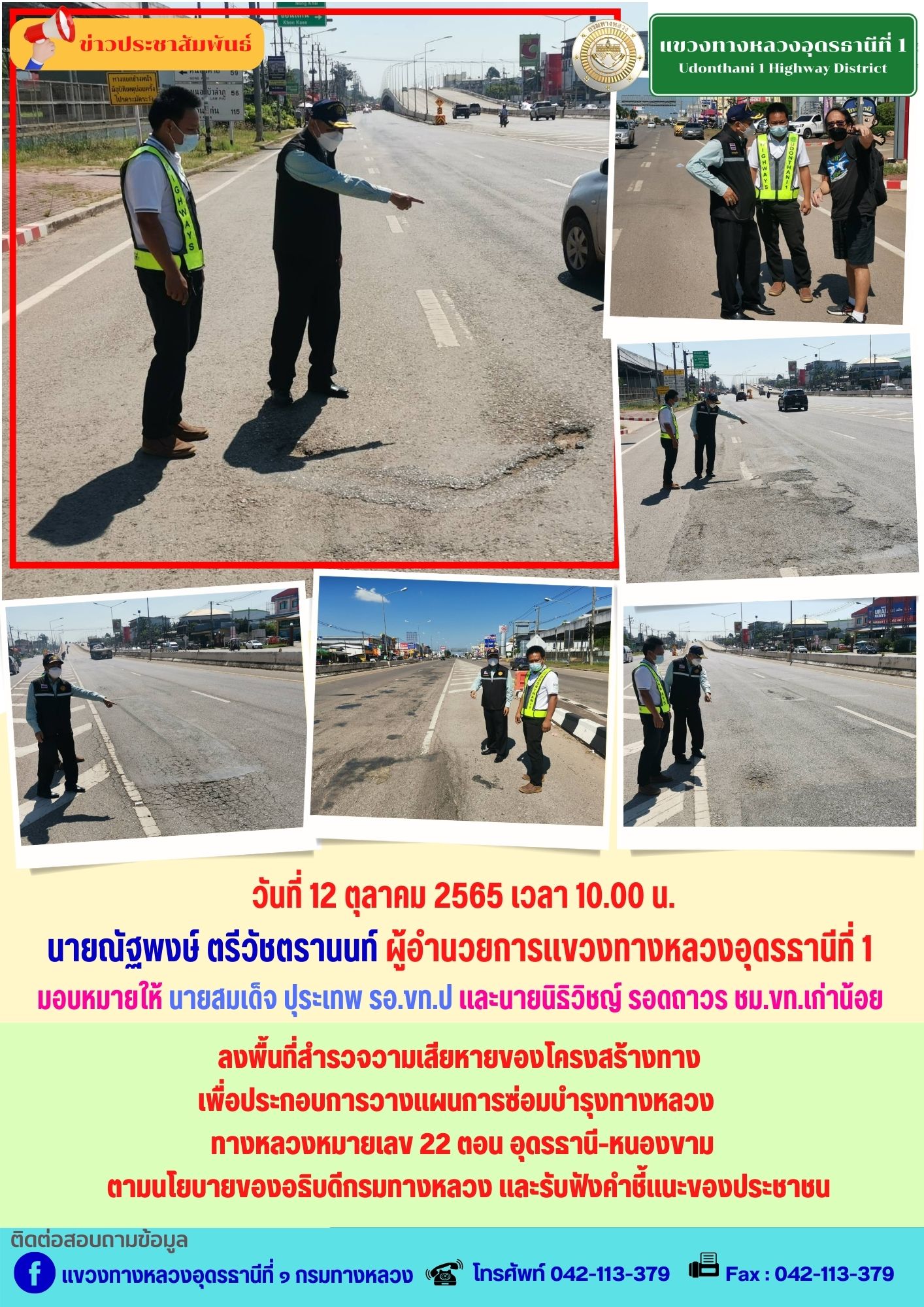 ลงพื้นที่สำรวจวามเสียหายของโครงสร้างทาง เพื่อประกอบการวางแผนการซ่อมบำรุงทางหลวง ทางหลวงหมายเลข 22 ตอน อุดรธานี-หนองขาม ตามนโยบายของอธิบดีกรมทางหลวง และรับฟังคำชี้แนะของประชาชน