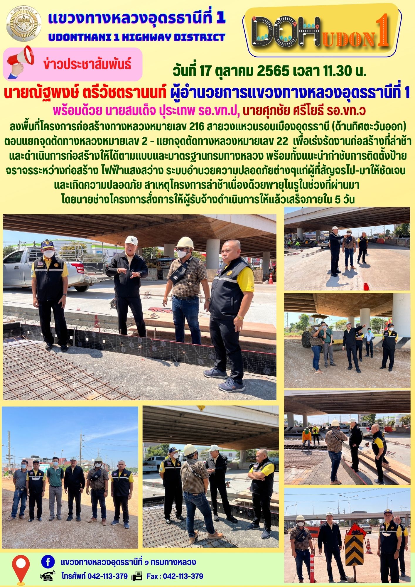 ลงพื้นที่โครงการก่อสร้างทางหลวงหมายเลข 216 สายวงแหวนรอบเมืองอุดรธานี (ด้านทิศตะวันออก) ตอนเเยกจุดตัดทางหลวงหมายเลข 2 - แยกจุดตัดทางหลวงหมายเลข 22 เพื่อเร่งรัดงานก่อสร้างที่ล่าช้าและดำเนินการก่อสร้างให้ได้ตามแบบและมาตรฐานกรมทางหลวง