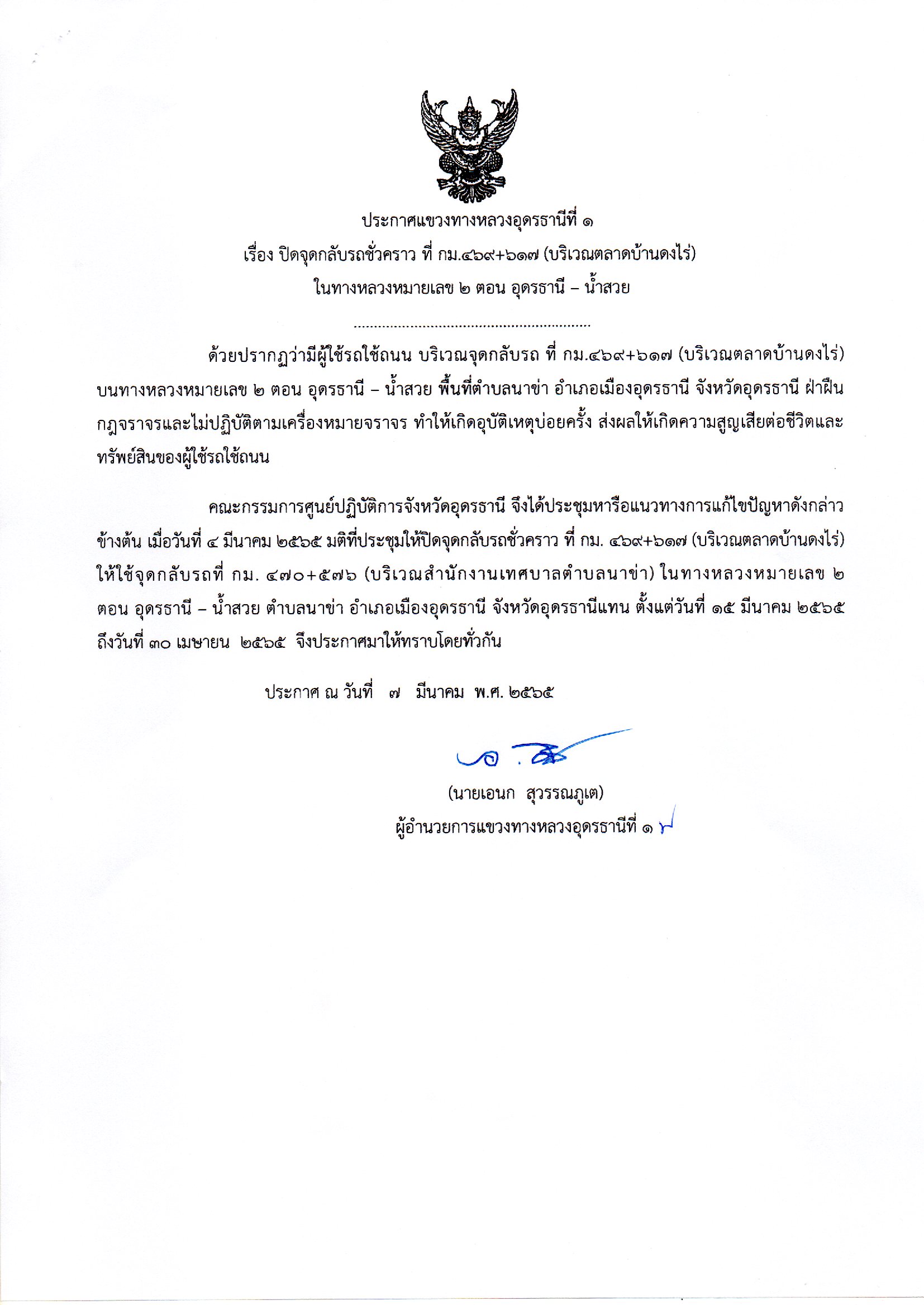 #ประกาศปิดจุดกลับรถชั่วคราว ด้วย กรมทางหลวง โดย แขวงทางหลวงอุดรธานีที่ 1 จะทำการ ปิดจุดกลับรถชั่วคราวในทางหลวงหมายเลข 2 กม.ที่ 469+617 (ตลาดบ้านดงไร่) โดยให้ไปใช้จุดกลับรถที่ กม.470+576 (สำนักงานเทศบาลตำบลนาข่า) ตำบลนาข่า อำเภอเมืองอุดรธานี จังหวัดอุดรธานี ระหว่างวันที่ 15 มีนาคม - 30 เมษายน 2565