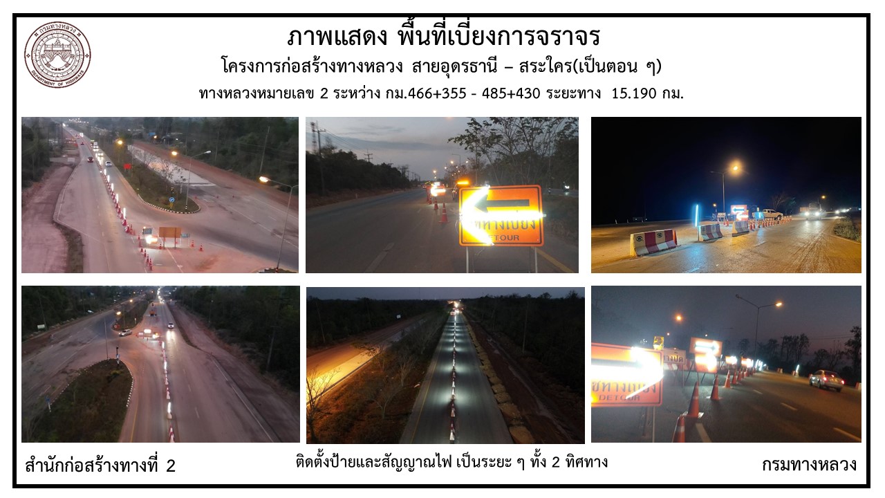 โครงการก่อสร้างทางหลวงหมายเลข 2 สายอุดรธานี – อำเภอสระใคร จะทำการเบี่ยงการจราจรและปิดจุดกลับรถ เพื่อการก่อสร้าง CONCRETE PAVEMENT บนคันทางเดิมรวมทั้งส่วนขยาย