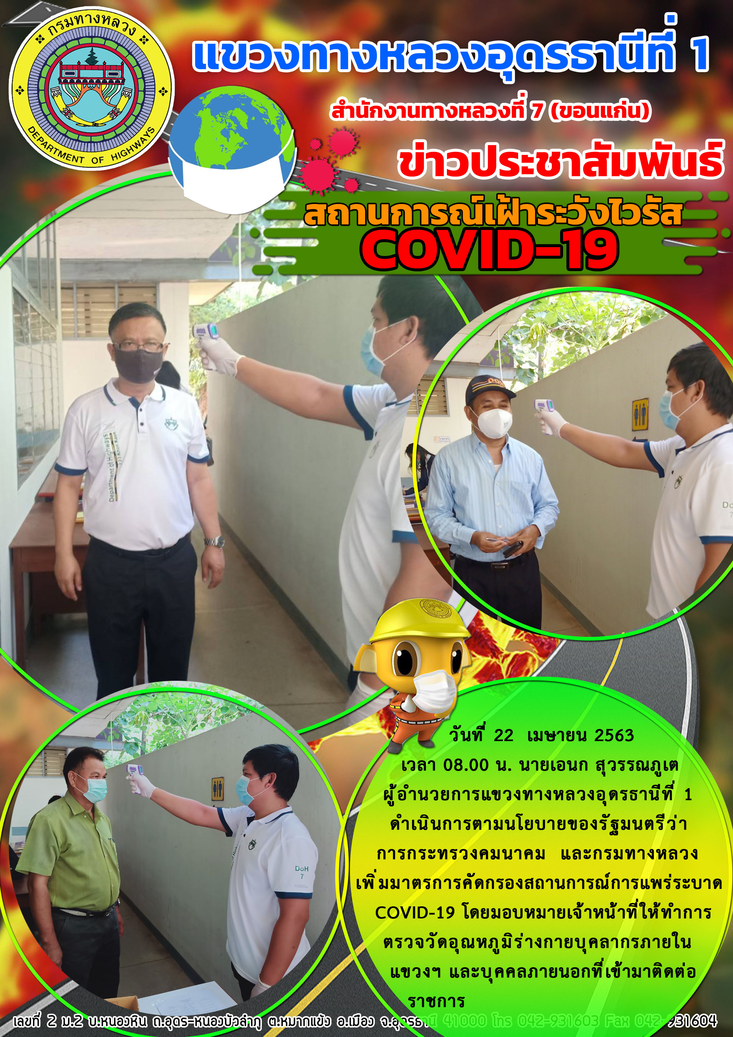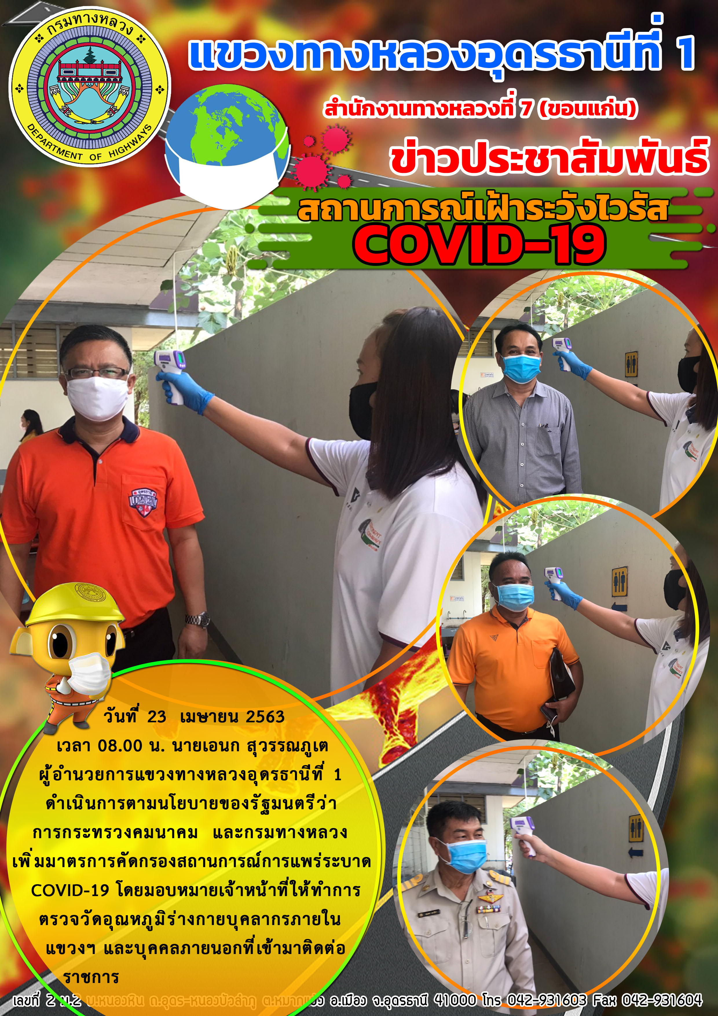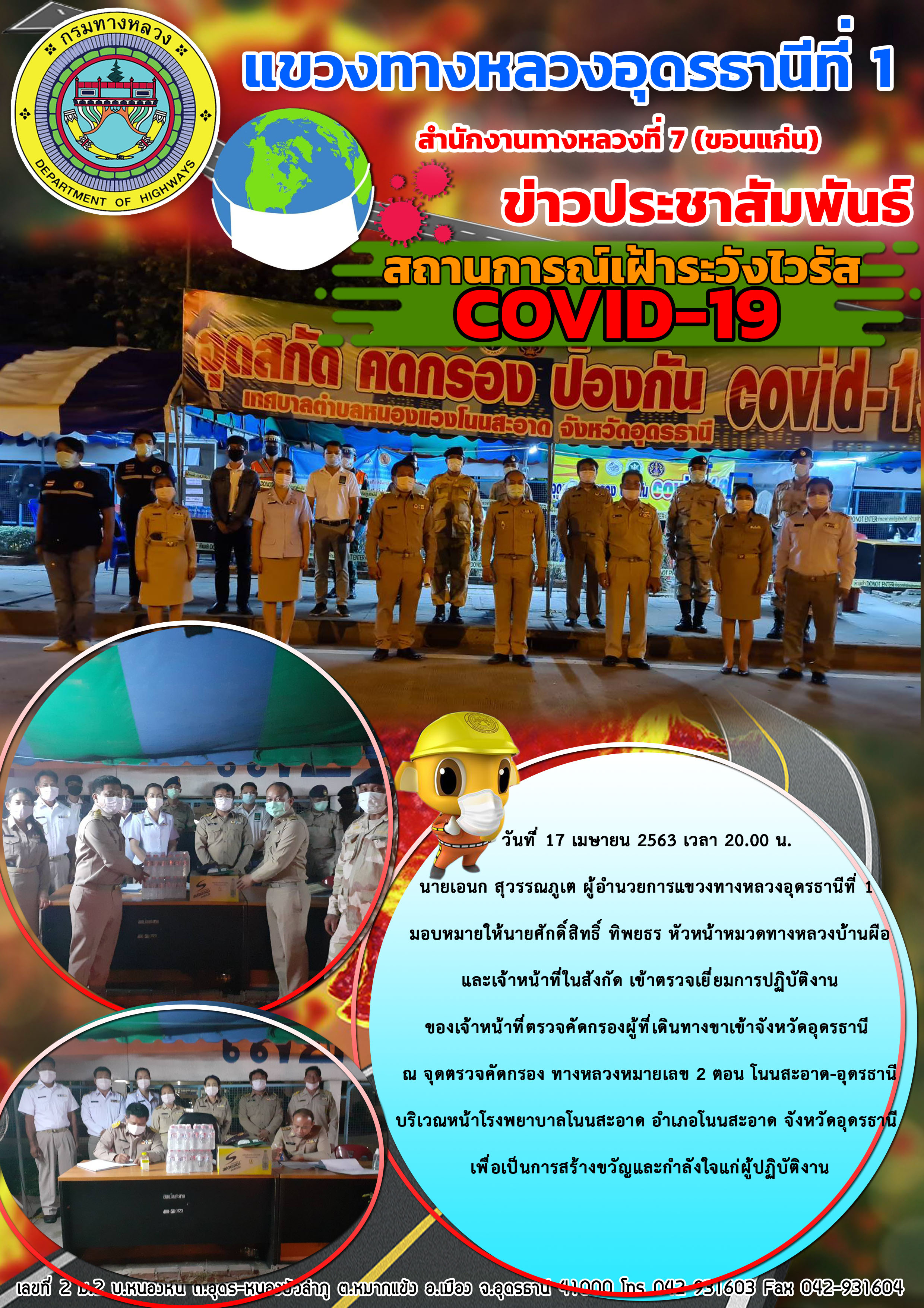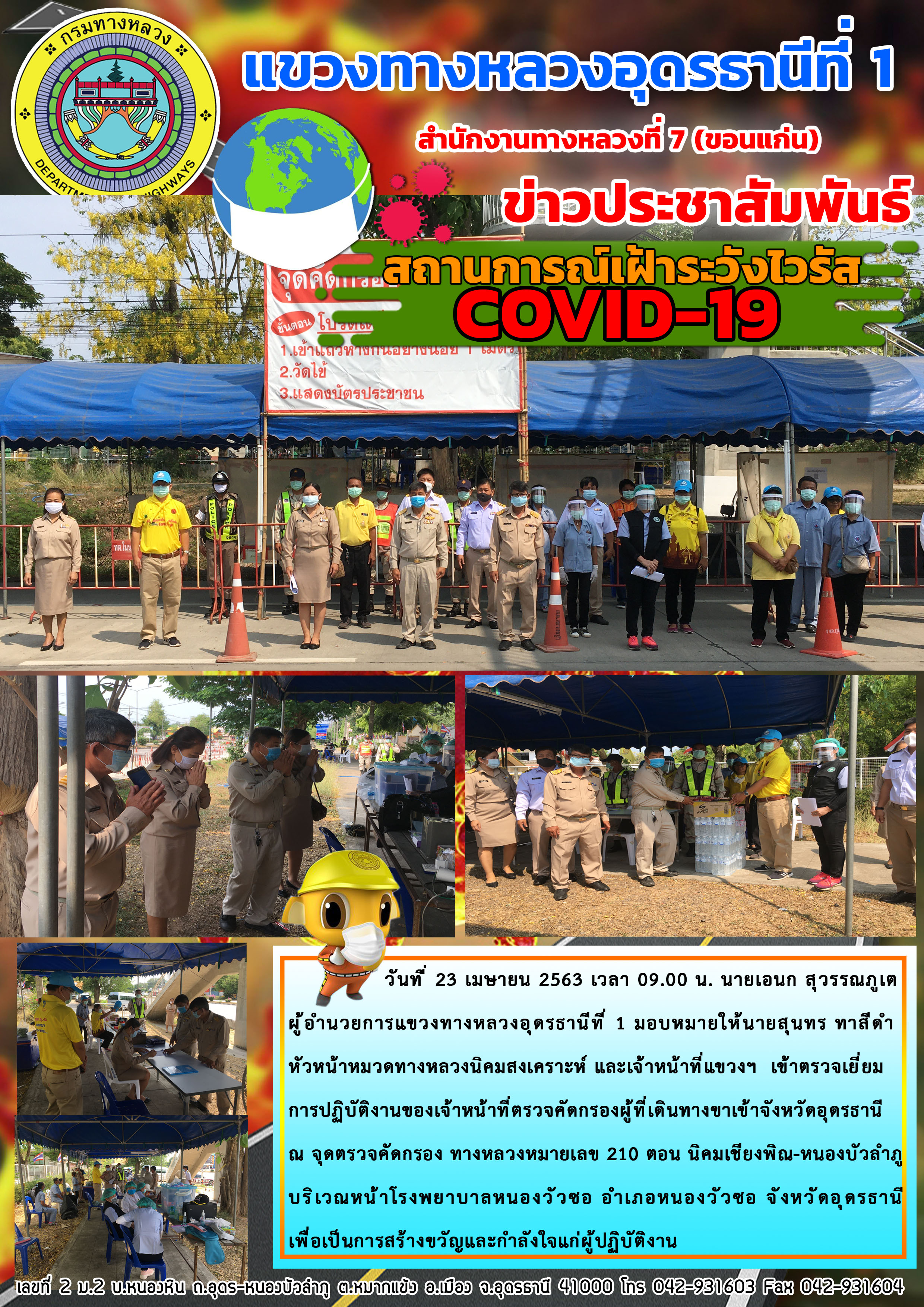 เข้าตรวจเยี่ยม การปฏิบัติงานของเจ้าหน้าที่ตรวจคัดกรองผู้ที่เดินทางขาเข้าจังหวัดอุดรธานี 23-04-63 |