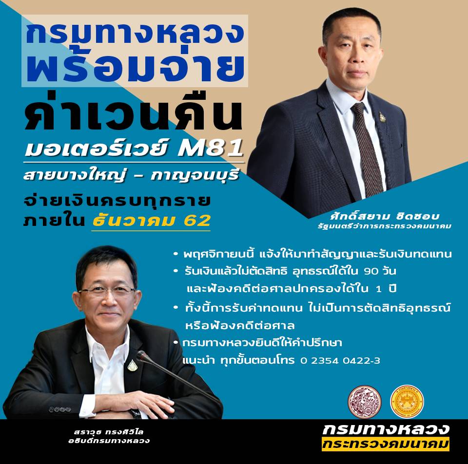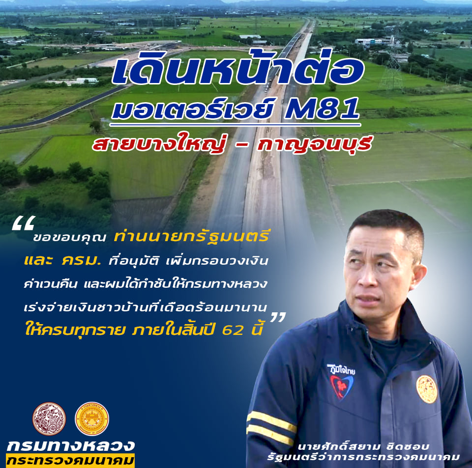 กรมทางหลวงพร้อมจ่ายค่าเวนคืน มอเตอร์เวย์ M81 สายบางใหญ่-กาญจนบุรี ครบทุกรายภายใน ธันวาคม 62