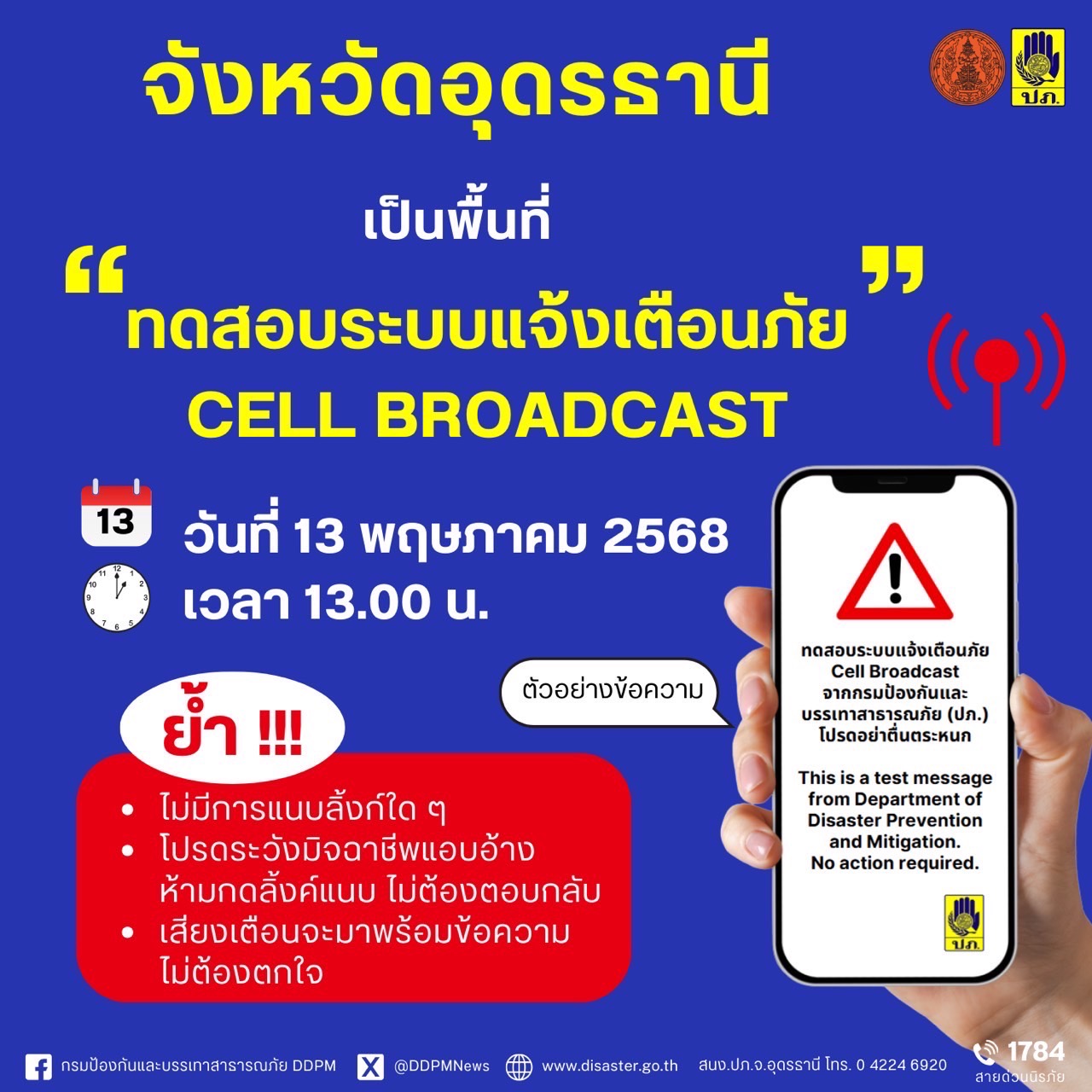 ประชาสัมพันธ์การทดสอบระบบแจ้งเตือนภัยผ่านสัญญาณ โทรศัพท์เคลื่อนที่(Cell Broadcast) จังหวัดอุดรธานี ในวันที่ 13 พฤษภาคม 2568 เวลา 13.00 น.
