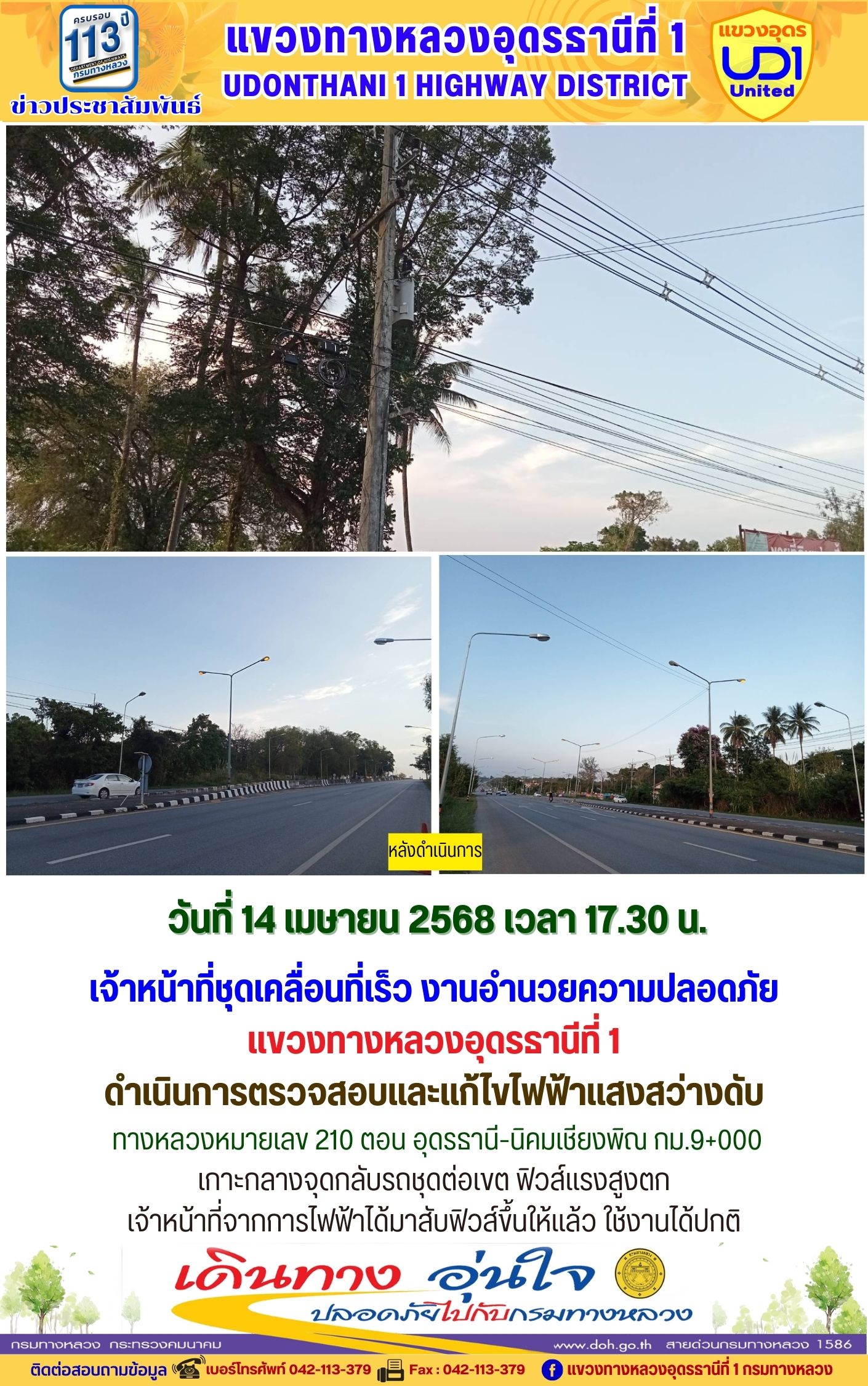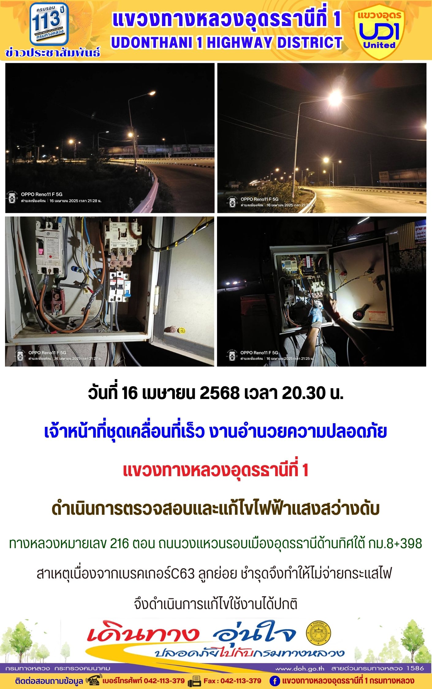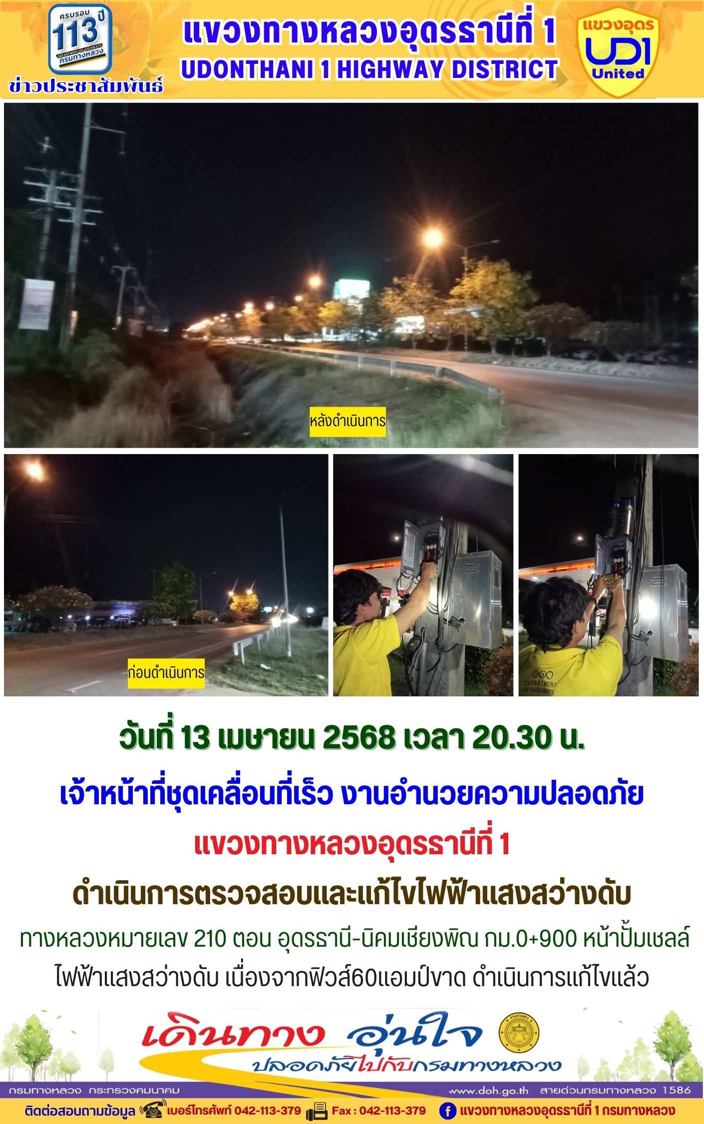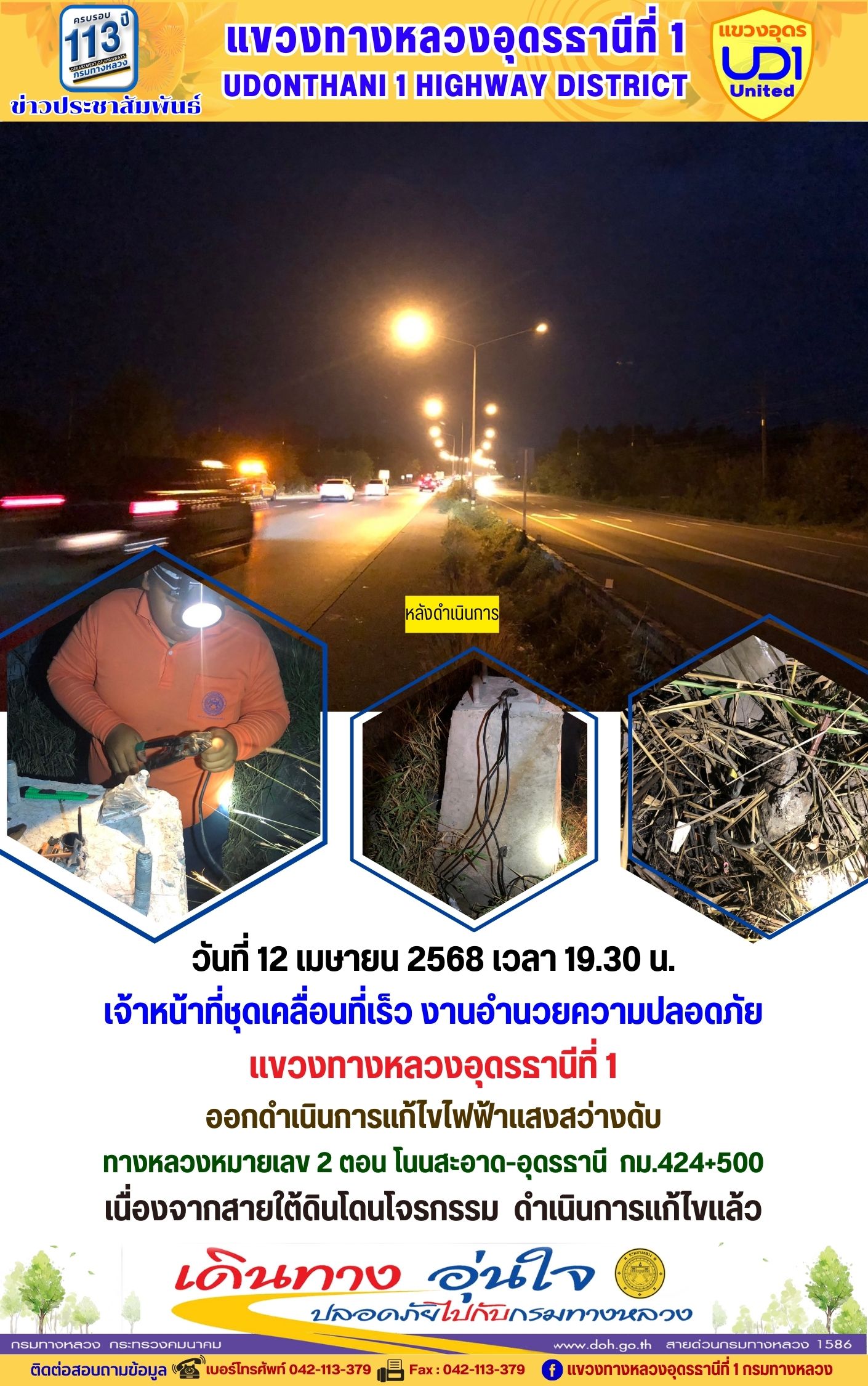 120 12/04/2568 ออกดำเนินการแก้ไขไฟฟ้าแสงสว่างดับ ทางหลวงหมายเลข 2 ตอน โนนสะอาด-อุดรธานี กม.424+500