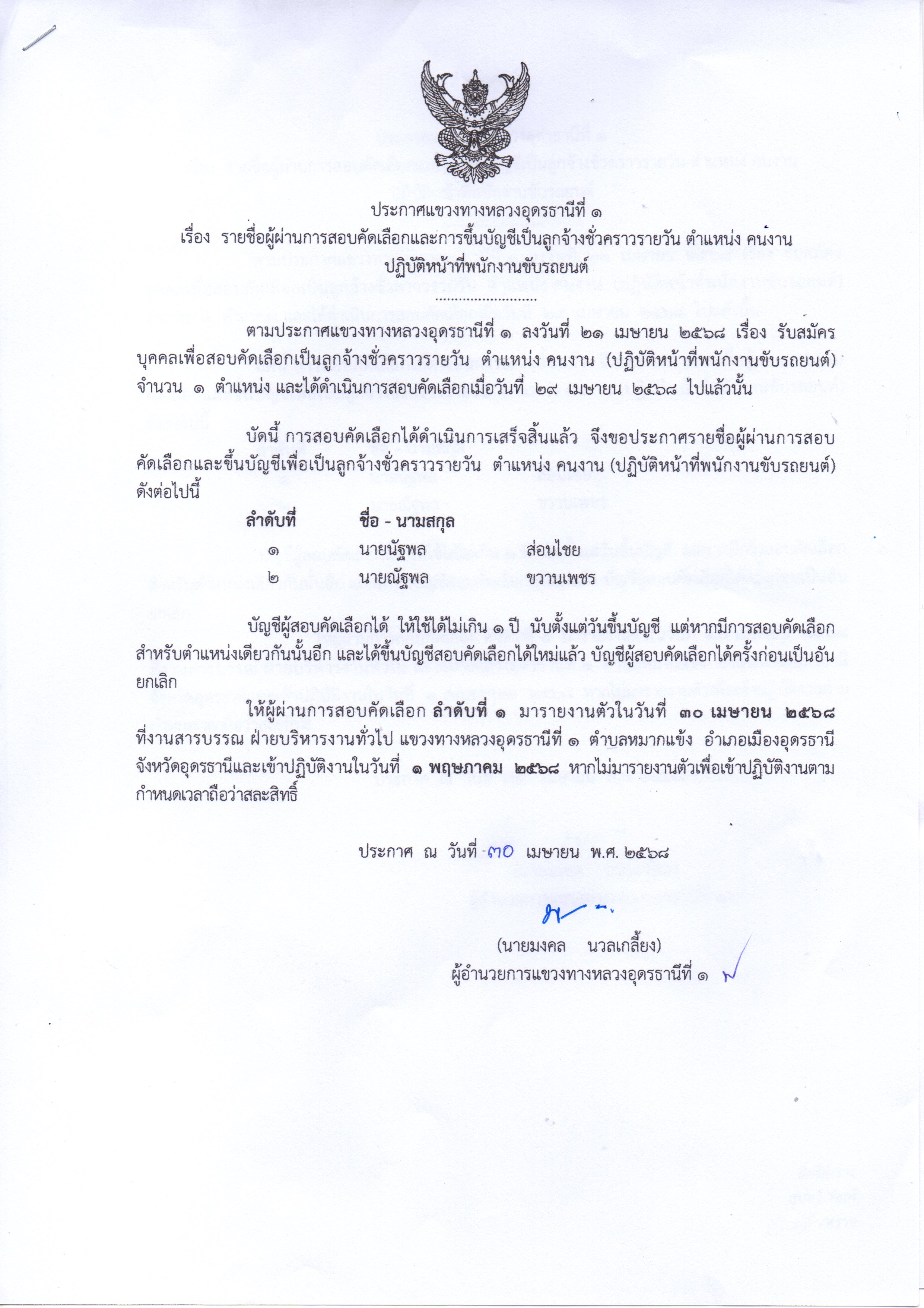 ประกาศแขวงทางหลวงอุดรธานีที่ 1 เรื่อง รายชื่อผู้ผ่านการสอบคัดเลือกและการขึ้นบัญชีเป็นลูกจ้างชั่วคราว