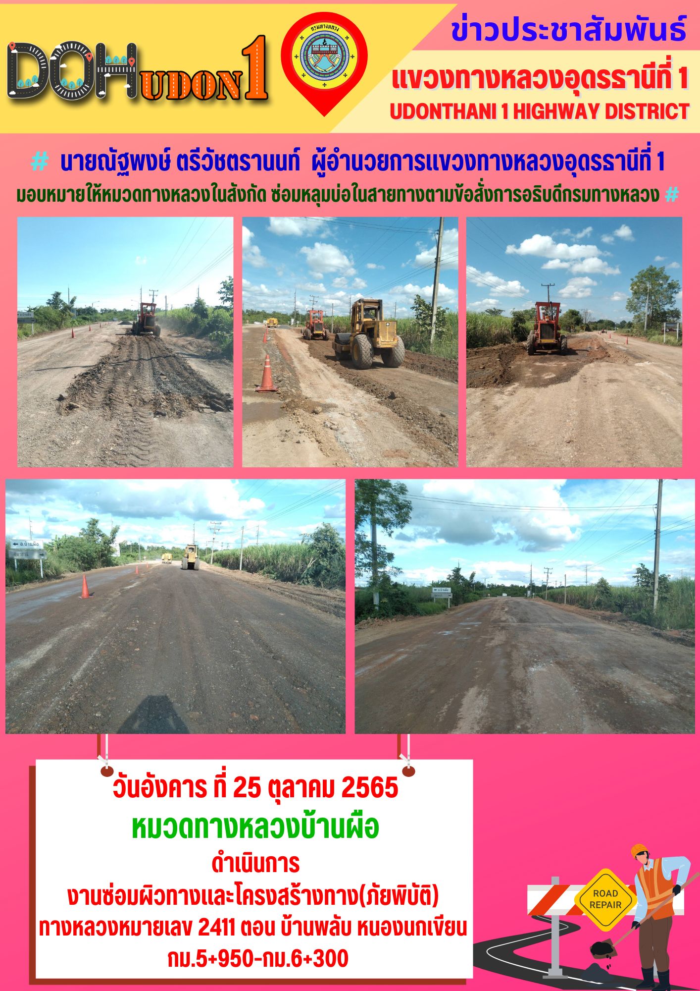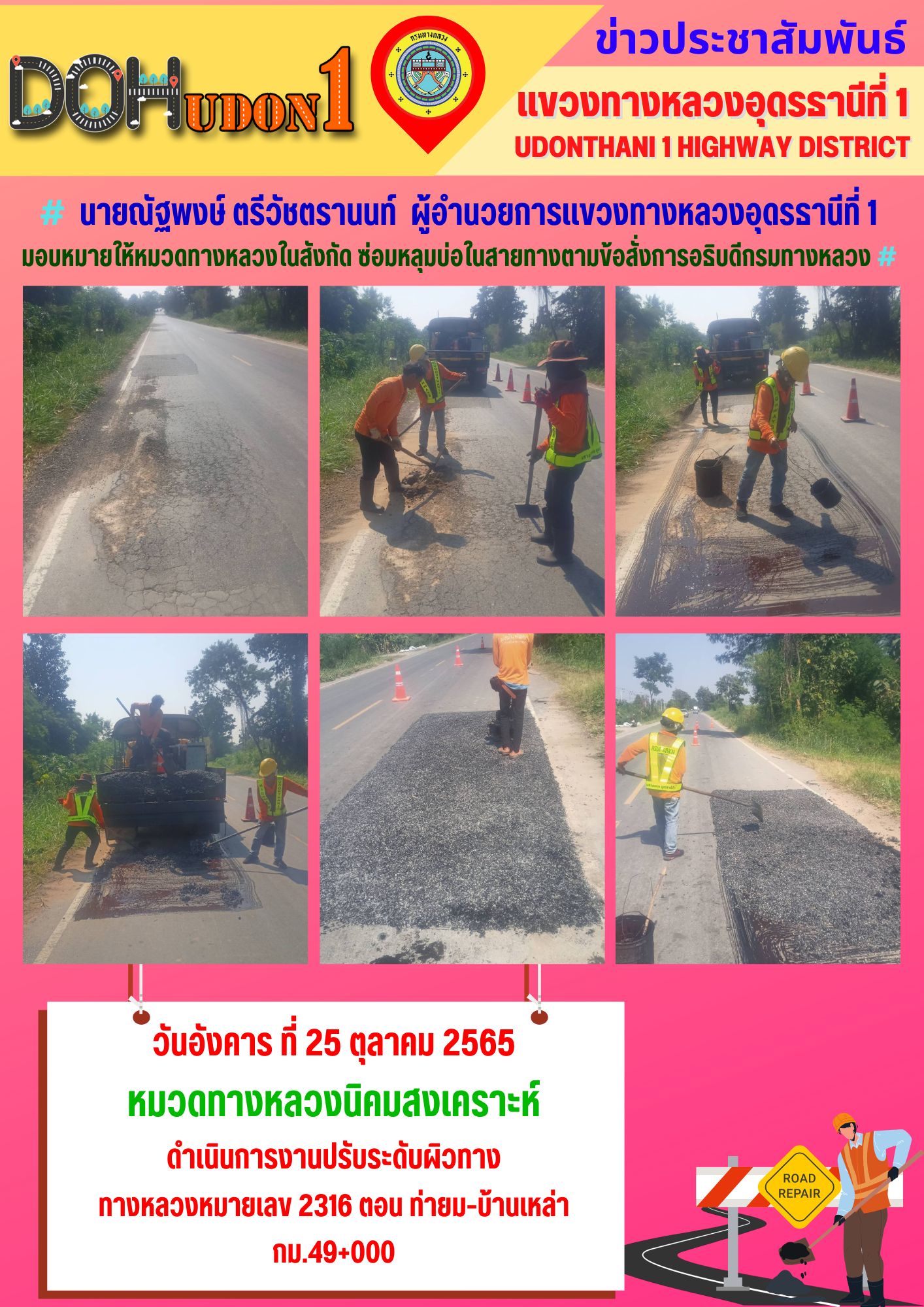นายณัฐพงษ์ ตรีวัชตรานนท์ ผู้อำนวยการแขวงทางหลวงอุดรธานีที่ 1 มอบหมายให้หมวดทางหลวงในสังกัด ซ่อมหลุมบ่อในสายทางตามข้อสั่งการอธิบดีกรมทางหลวง
