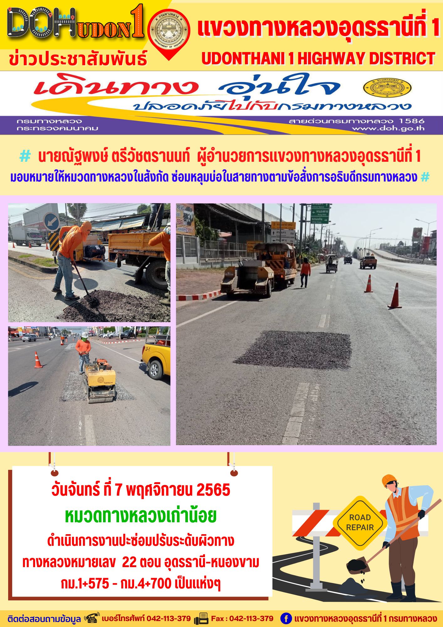 นายณัฐพงษ์ ตรีวัชตรานนท์ ผู้อำนวยการแขวงทางหลวงอุดรธานีที่ 1 มอบหมายให้หมวดทางหลวงในสังกัด ซ่อมหลุมบ่อในสายทางตามข้อสั่งการอธิบดีกรมทางหลวง