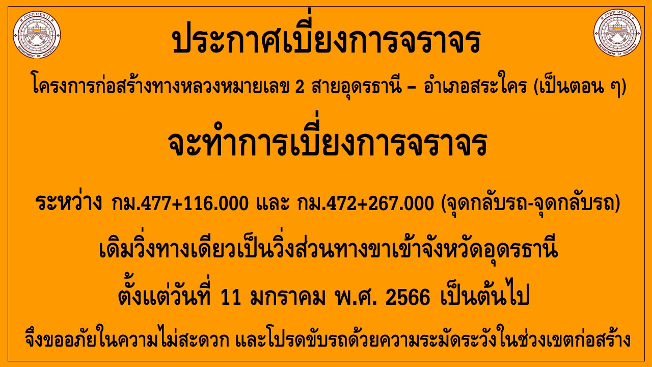 โครงการก่อสร้างทางหลวงหมายเลข 2 สายอุดรธานี – อำเภอสระใคร (เป็นตอน ๆ) ผู้รับจ้างมีความประสงค์ จะทำการเบี่ยงการจราจร ระหว่าง กม.477+116.000 และ กม.472+267.000 (จุดกลับรถ-จุดกลับรถ)