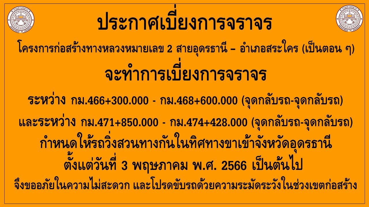ประกาศเบี่ยงการจราจร โครงการก่อสร้างทางหลวงหมายเลข 2 สายอุดรธานี – อำเภอสระใคร (เป็นตอน ๆ) จะทำการเบี่ยงการจราจร