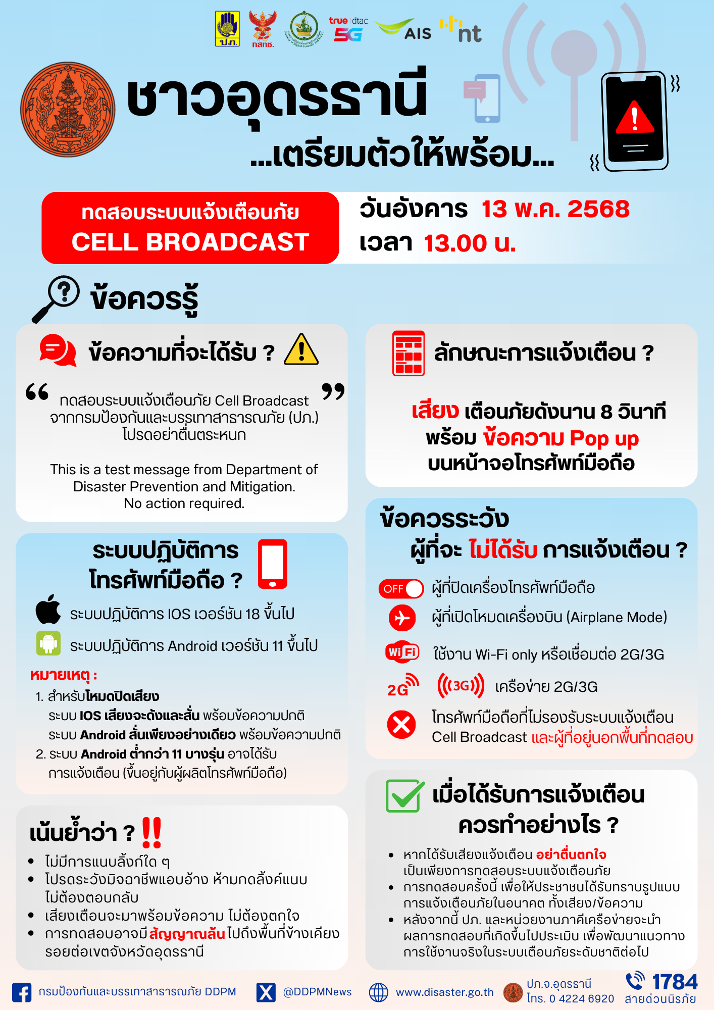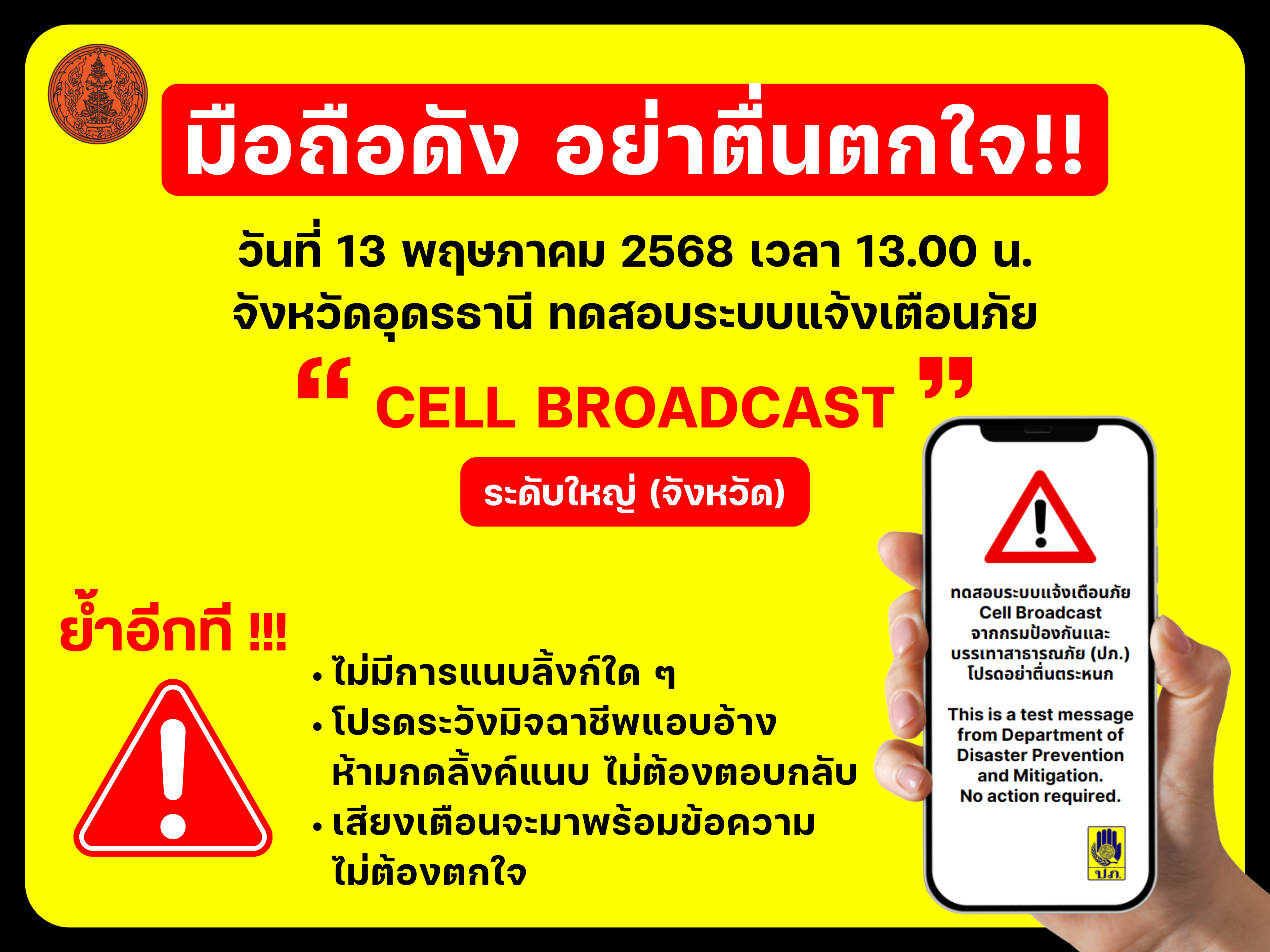 ประชาสัมพันธ์การทดสอบระบบแจ้งเตือนภัยผ่านสัญญาณ โทรศัพท์เคลื่อนที่(Cell Broadcast) จังหวัดอุดรธานี ในวันที่ 13 พฤษภาคม 2568 เวลา 13.00 น.