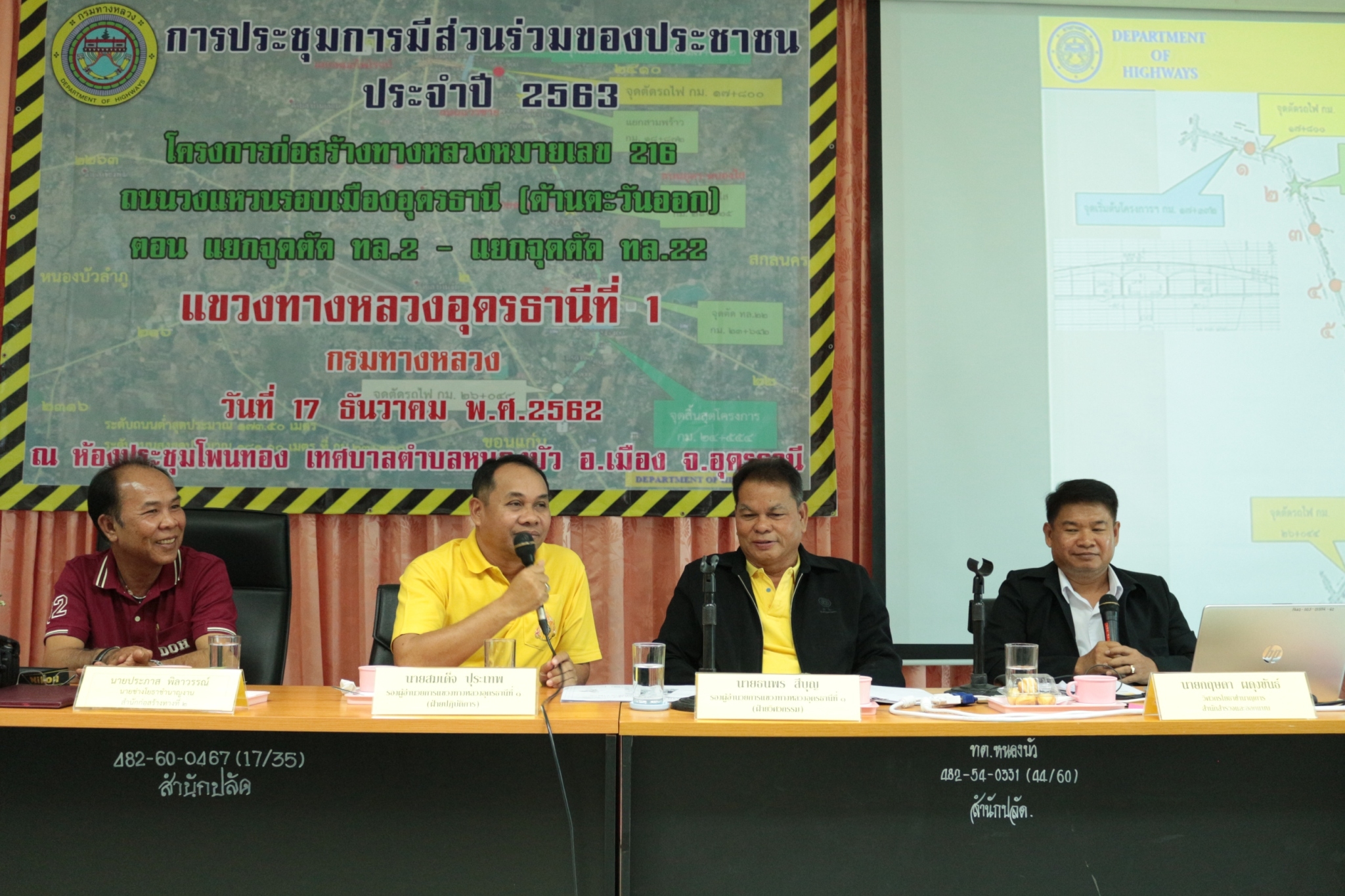 วันที่ 17 ธันวาคม 2562 เวลา 09.00 น. แขวงทางหลวงอุดรธานีที่ 1 ดำเนินการจัดการประชุมการมีส่วนร่วมของประชาชน ปี 2563 โครงการก่อสร้างทางหลวงหมายเลข 216 ถนนวงแหวนรอบเมืองอุดรธานี (ด้านทิศตะวันออก) ตอน แยกจุดตัด ทางหลวงหมายเลข 2 - ทางหลวงหมายเลข 22 ณ ห้องประชุมโพนทอง เทศบาลตำบลหนองบัว อ.เมือง จ.อุดรธานี โดยมีรองผู้ว่าราชการจังหวัดอุดรธานี นายกองเอกปราโมทย์ ธัญญพืช เป็นประธานในพิธี วิทยากรบรรยายโครงการโดย นายกฤษดา ผดุงขันธ์ วิศวกรโยธาชำนาญการ สำนักสำรวจและออกแบบ กรมทางหลวง ผู้เข้าร่วมประชุมเป็นผู้เกี่ยวข้องและมีส่วนได้เสียในพื้นที่ก่อสร้าง ประมาณ 150 คน